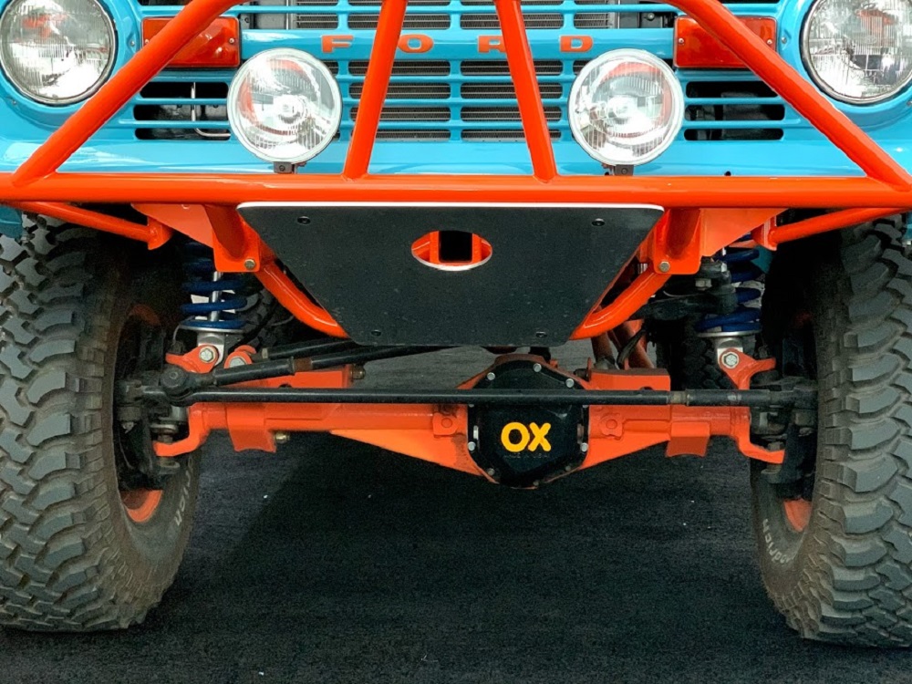 It rocks more power than the first-gen Broncos of the era. Under the hood there is a Ford 377 cid (6.2 L) Stroker V8 engine, Edelbrock EFI and Powertrain control system, Ford AOD transmission, custom headers and exhaust system, It pumps out 570 horsepower and features a host of off-roading mods.