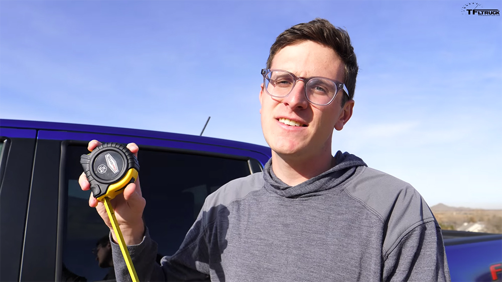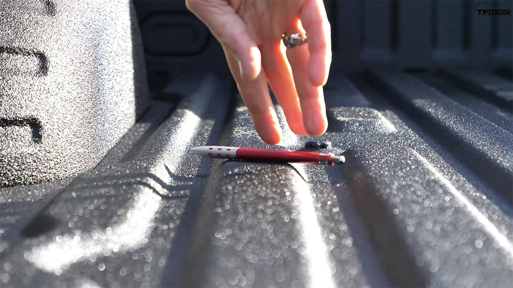 Now here’s a good test for you. While both truck beds measure about 21 inches in depth, to demonstrate the difference in liftover height, the hosts drop a pen into the bed and attempt to retrieve it. While we see where they’re going, Roman makes it look reasonably easy as he is over six feet tall.