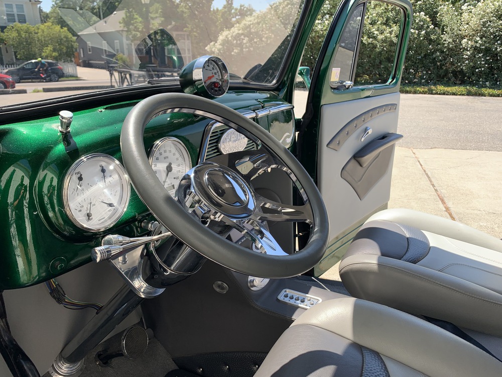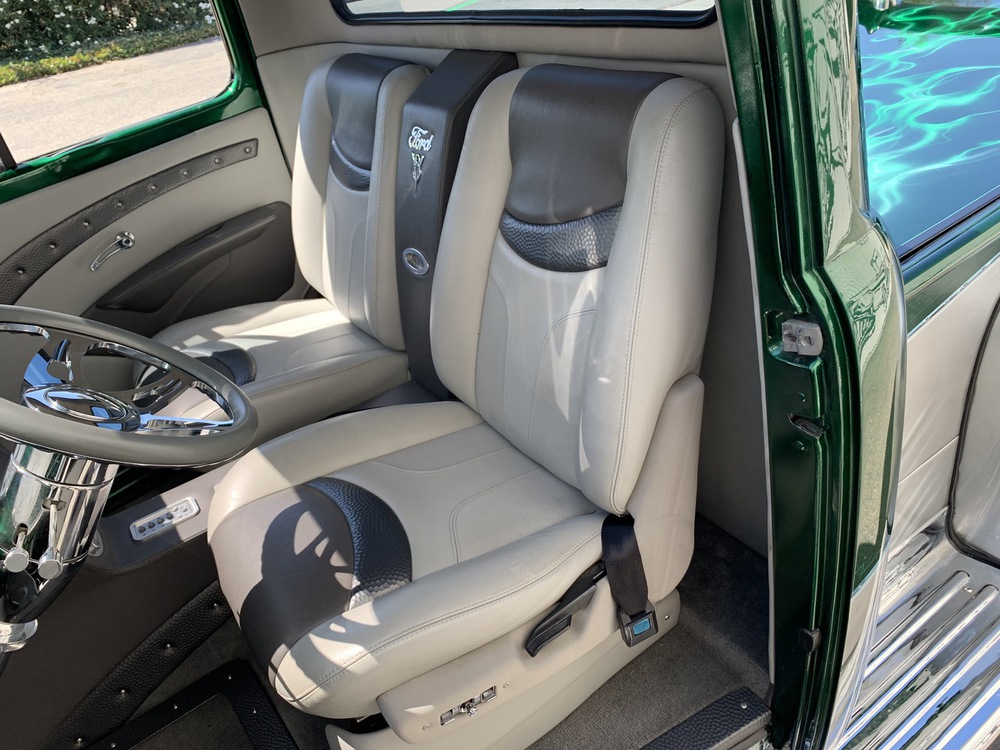 We love the custom details, and the true-blue Ford badging. Modern seating in gray leather is a welcome upgrade, and the custom work done on the dash and glovebox is meticulous and very cool. Plus the two-door, two-seater has A/C, and an upgraded kickass sound system.
