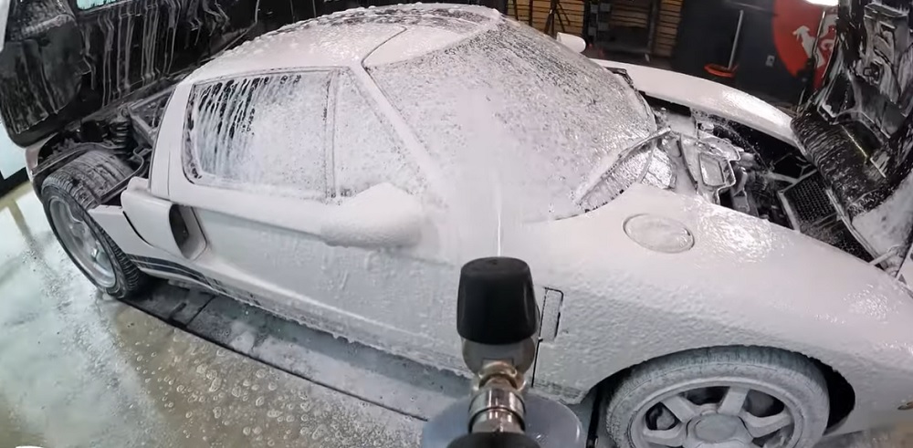 The car is vacuumed first. Then the dirt is air blasted out of the crevices. A power wash is next to further loosen the stubborn dirt. Then a nice foamy agitation wash takes place. The wheels are then cleaned. Compressed air is used again to blow out any debris that was missed. The headlights are restored and buffed clear. Moving to the inside the car the seats and floorboards were removed so the entire area could be cleaned. The interior is treated to a deep steam clean. The exterior is washed again. The next day the car is taken to the shop for a fresh oil change. And while it is on the lift the undercarriage is cleaned. The wheels and valve covers are removed and refinished. New tires were mounted. The end result is what looks like a brand new 2005 Ford GT.