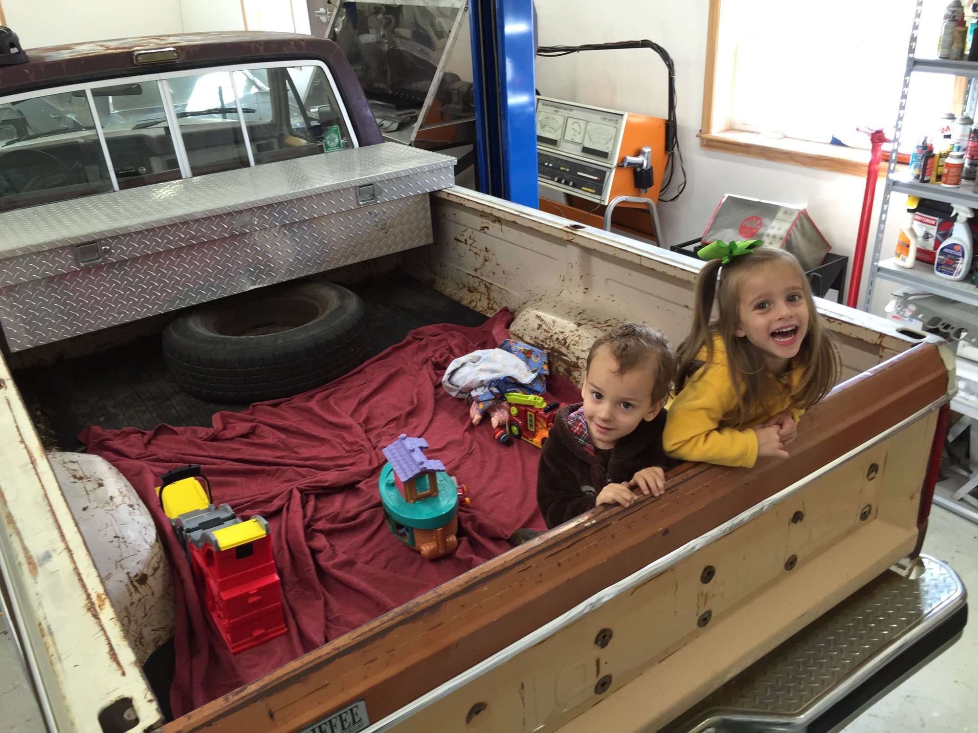 As for what I did today with my truck, I found a new use for Rusty. The grandtwins are staying with us and love to play in Rusty, but heretofore it has been in the cab. Today they graduated to the bed.