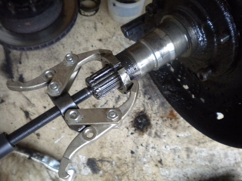 Outer nut off, washer with alot of holes off, inner nut off, hub-rotor off. Outer bearing will come with it. See the PIN on lower right? Come install time that HAS to be facing OUT and it is the 1st nut back on after the bearing and hub and rotor are back on.