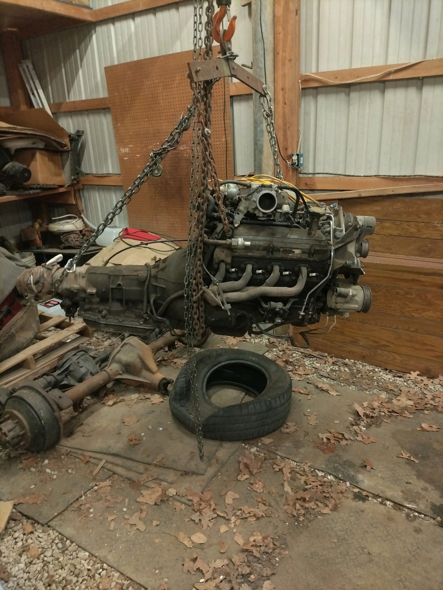 Well I went and got it today, tractor set the eng and trans in the tow rigs truck bed and the ol winch dragged the car on easy enough. Now to get then motor inside and separated from the trans and on an eng stand. This is a winter project in the making. I lifted the hood for 30 sec to see if it had the rest of the parts I need. It did and NO I did not look for your Y pipe, but I will.