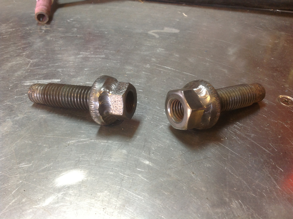 With the shear bolts out and on the work table I welded a nut to each one to make future installation and removal easier. you can see where the pipe wrench jaws were grabbing the round heads.