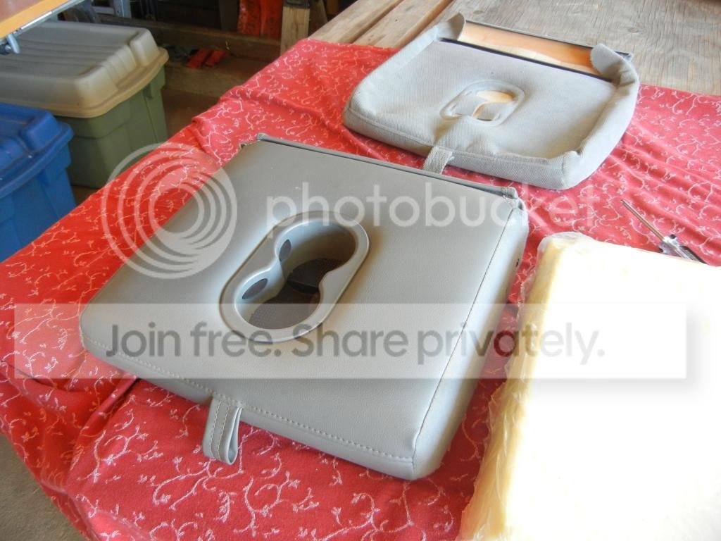 So here I took the two arm rests out (the old one and new one) and removed their covers. The covers are the same minus the hole cut for the cupholders and the foam pads are the same minus the hole cut as well.