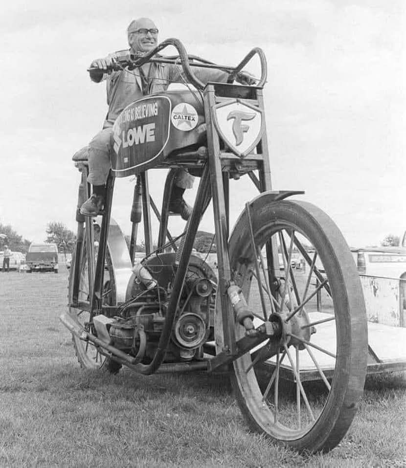 Reminds me of a high bike my brother and I had. The frame of the bike was turned upside down down and had the front forks extended. It has a regular bike seat with high rise handlebars. The front wheel was a small 20 incher.