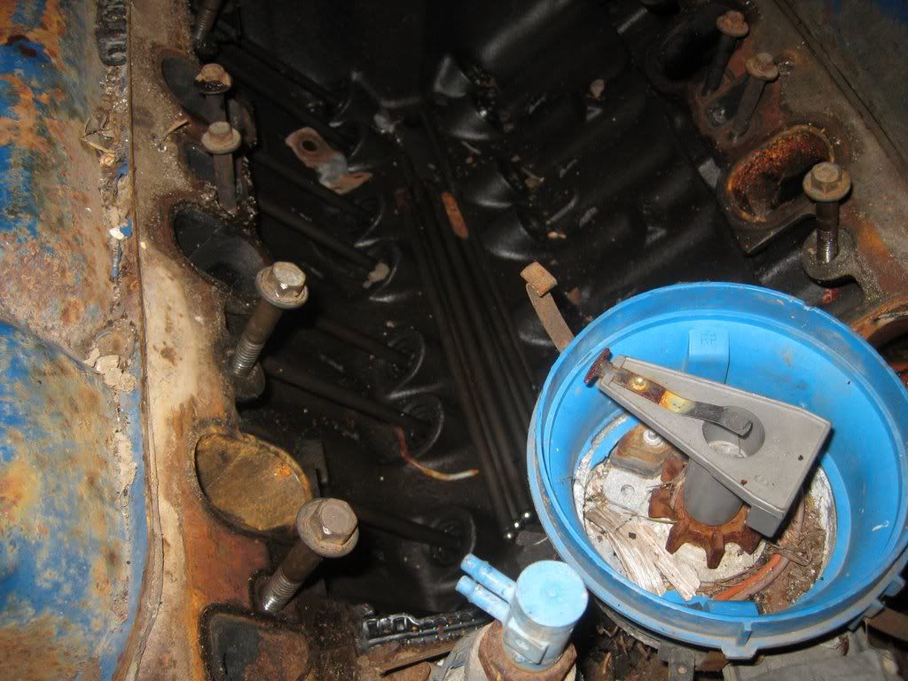 Alas, I opened her up and she actually looked really good. I guess it really IS whats on the inside that counts. I was able to turn the motor. Some water and a little rust underneath the 2-barrel. Not bad at all really. I will use it for parts, and eventually put it up for sale.
