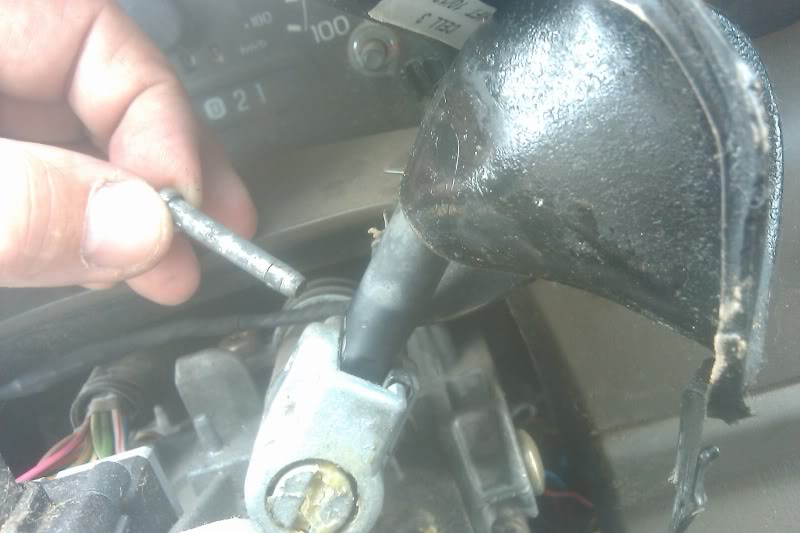 First, remove the (3) screws that hold the plastic trim around shifter. Unscrew the tilt steering lever and remove lower plastic piece. With ignition in 'on' position, press the little shiny ball on the bottom of key cylinder and remove the cylinder. Attachment 202621