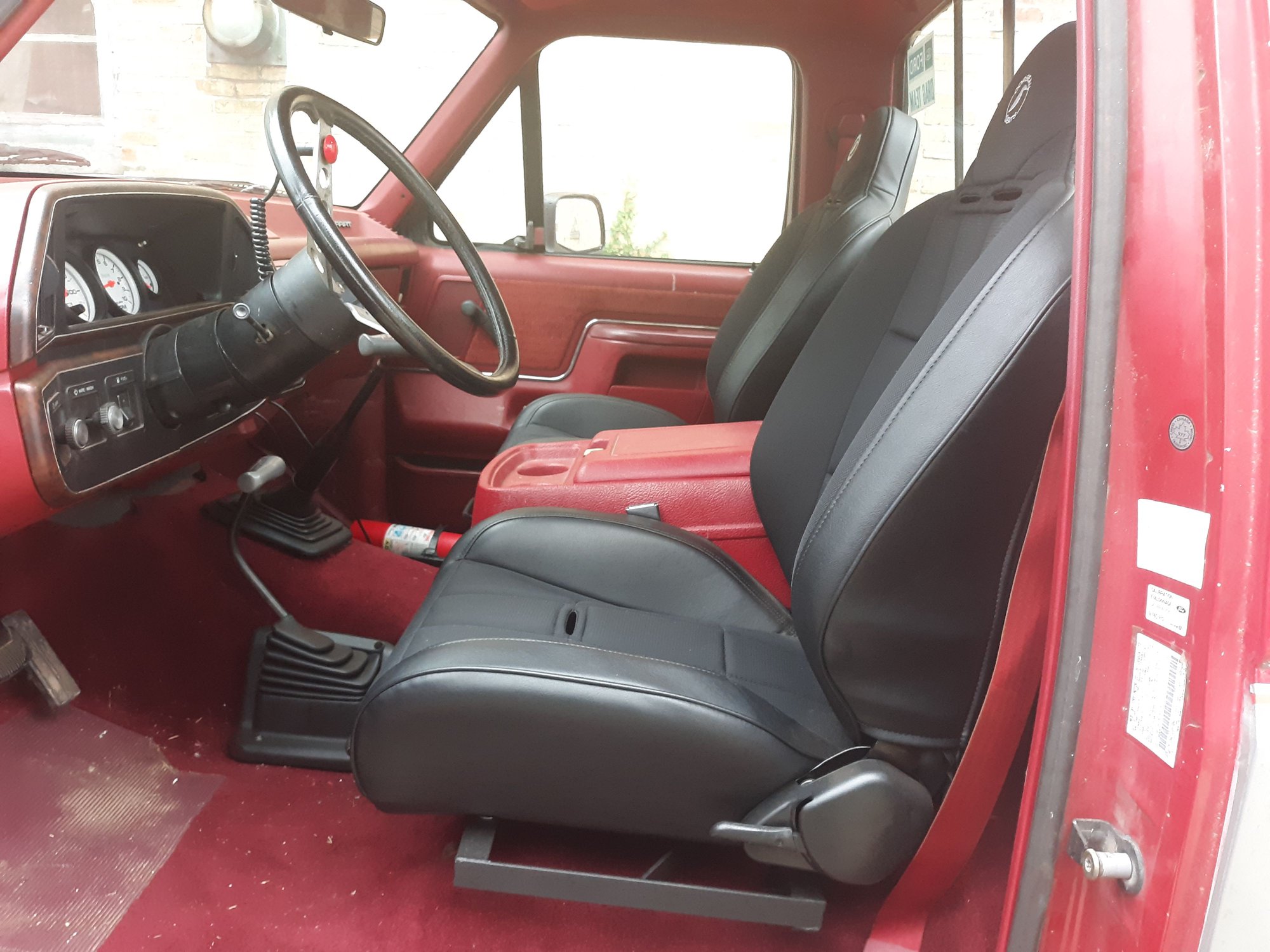 Corbeau suspension seats in my '94 F350. The Corbeau brackets bolted to the floor with no issue, lined up great. The space between the seats has exactly enough room for this console. I think it is out of a brick nose Bronco(?) but I honestly do not remember. If this were the truck I drove every day, I would have taken these out already. The side bolsters are a PITA to climb over to get out of the truck. Not a big deal for truck pulling, but would certainly suck if you got in and out of the thing every single day.