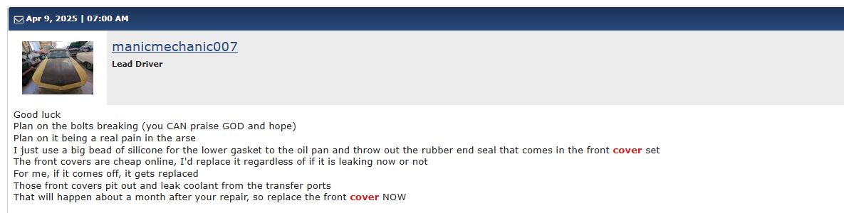 judging from the amount of black RTV that I scraped off the oil pan where the timing cover meets it, the previous owner applied a