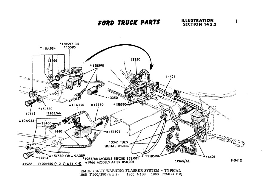 Here's the 'typical' drawing from the MPC. 1965 and 1966 through to end of April upper left and right. May 1966 onward in the lower left. The bracket holds the switch and the flasher 13350.