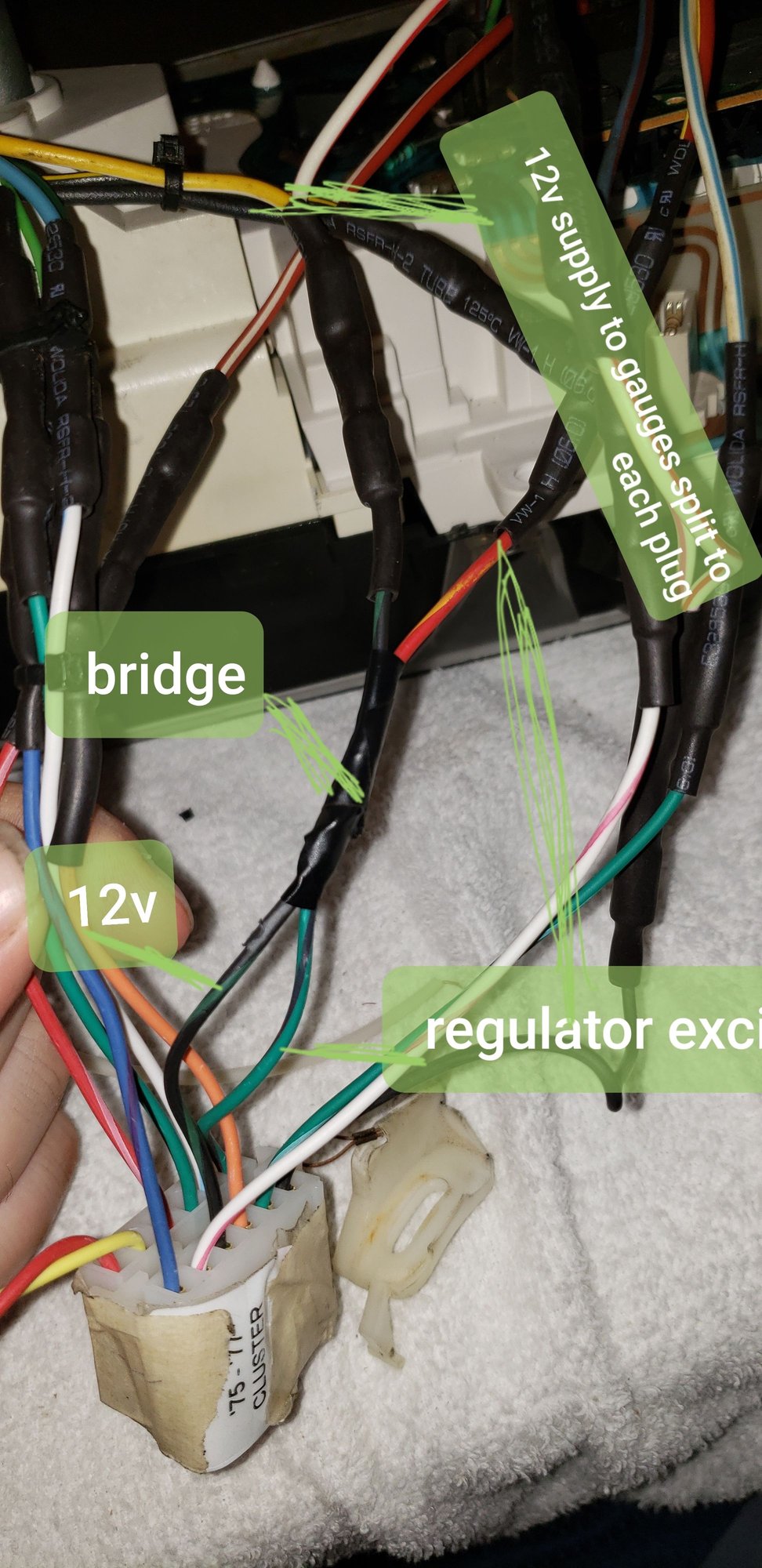 Attached is a pic of where the 12v source (Painless pin#7) is bridged/connected with the alternator regulator exciter (Painless pin#7) after these two wires are connected, they branch off gain to go out to the gauge cluster.