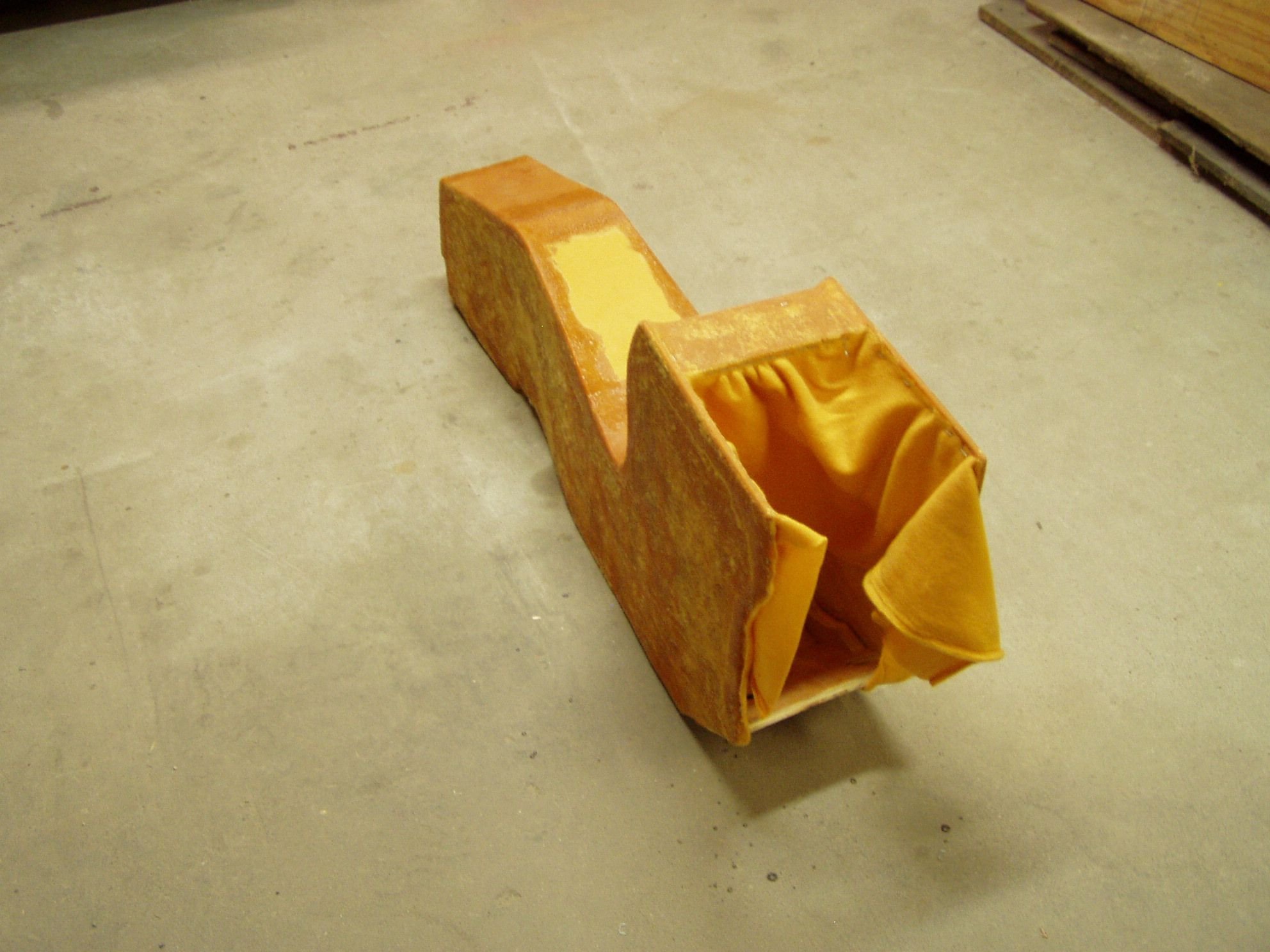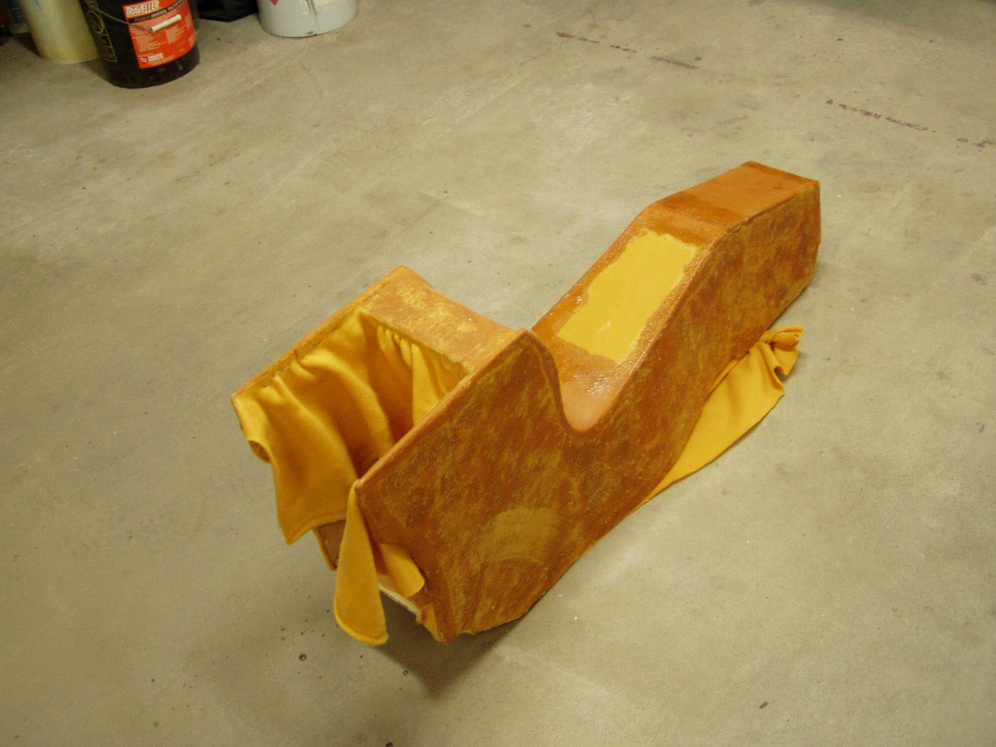 Moving right along........I guess I must have walked through the tuner section one time too many at the local cruise in....... cause I got the sudden urge to run to Wallyworld and buy a yard of the cheapest fleece I could find. $2.97 a yard got some designer orange and headed home. Lots of staple later stretching the fleece and around 30 ounces of polyester resin and the console is covered and ready for some mat placed in strategic locations. No resin where there will be a cutout for the shifter.