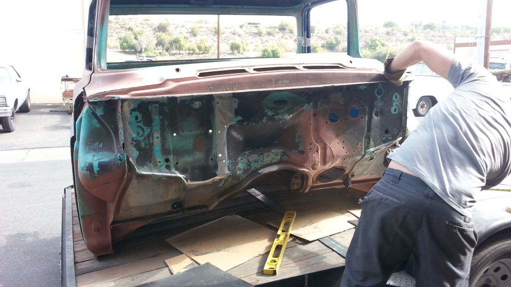 Here he's working across the front of the cab, he's fitting a piece of metal into the area he's cutting out, using 16Ga steel:
