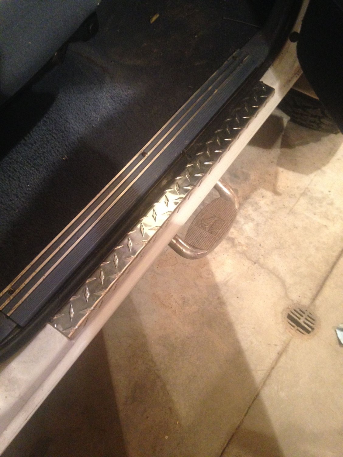 The last thing to set off the interior was the rocker covers. My buddy's Dad works at a stainless shop and they can pretty much make anything you can imagine. I asked if he could make up a pair of these for me in diamond plate. They're available from LMC smooth which I have for the Flareside, but I wanted something with some grip on it for the goofs climbing in the back. Plus it'll look good protecting my rockers too. Attached it with 3M tape.
