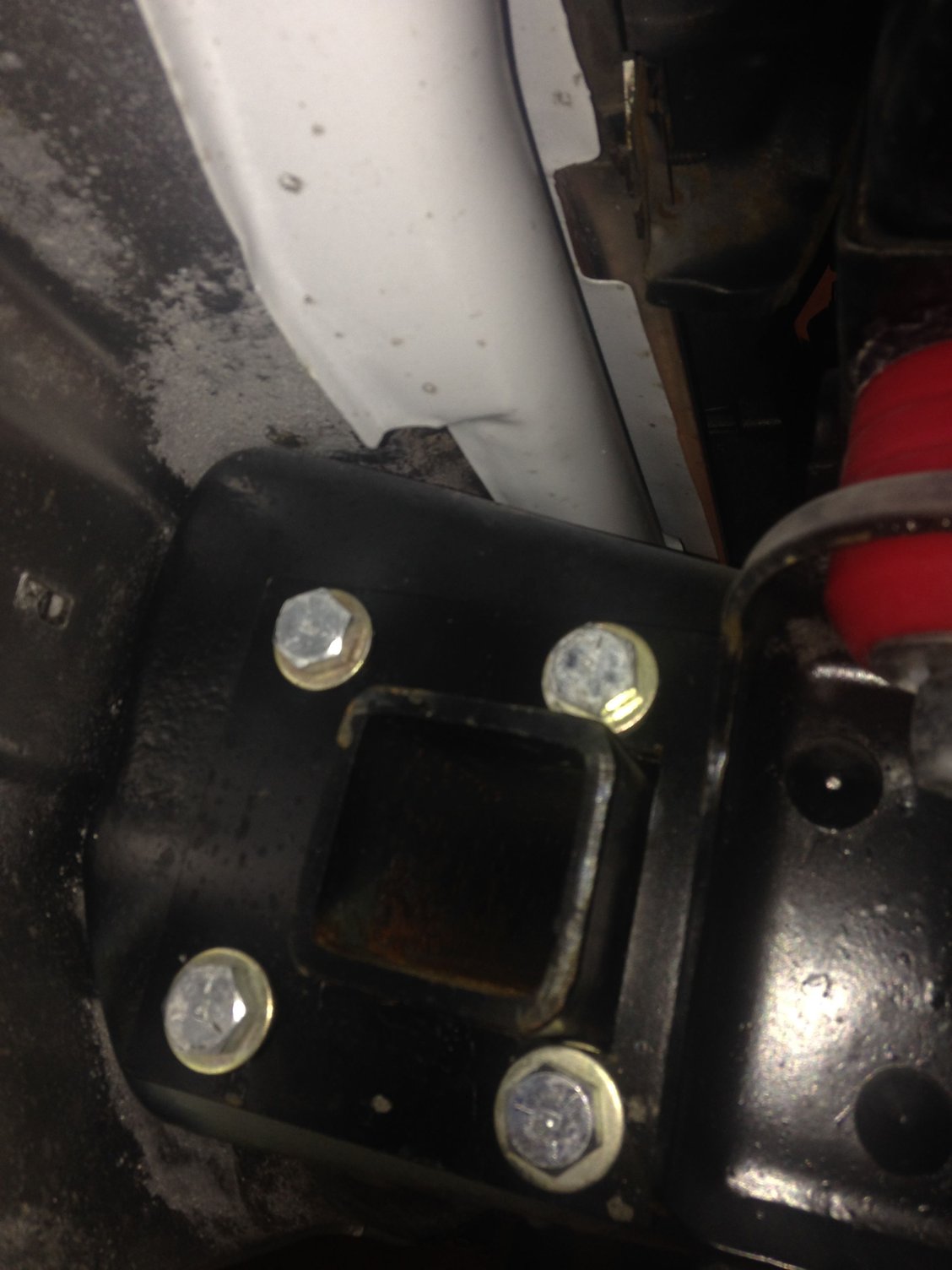 Driver's side framerail. Cut a square slot for the hitch to slide through. Bolted on a support plate for strength.