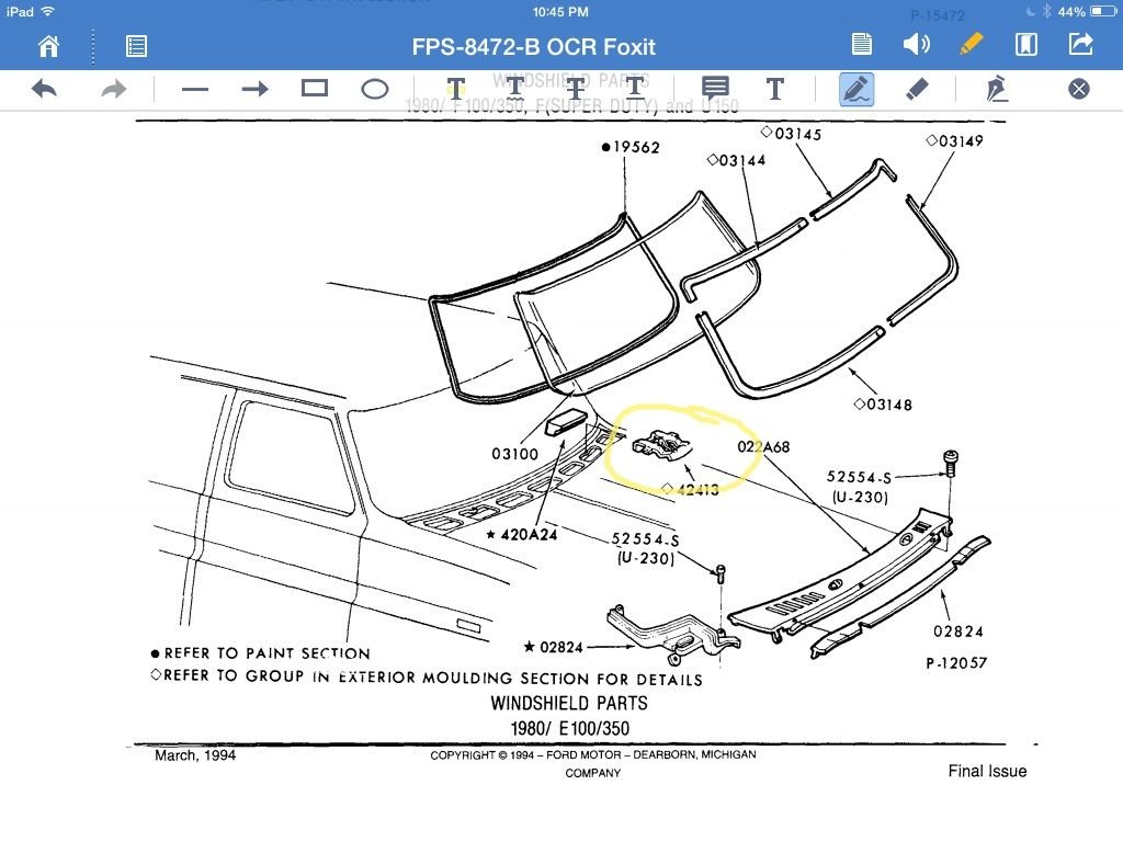 Bill - The original question was about the plastic clips, but I wasn't sure whether it was the one at the bottom or the other clips. So I needed to post a picture (illustration) of the clips used in holding the windshield trim on so that 5280 could tell me definitively which one he needs. I looked the whole catalog over, including the Exterior Moulding Section and found no picture for an F or U vehicle that included the clips/retainers. So, I posted the only illustration available that shows such a retainer - the one for the vans. And, indeed, 5280 did identify the retainer, so the plan worked.
