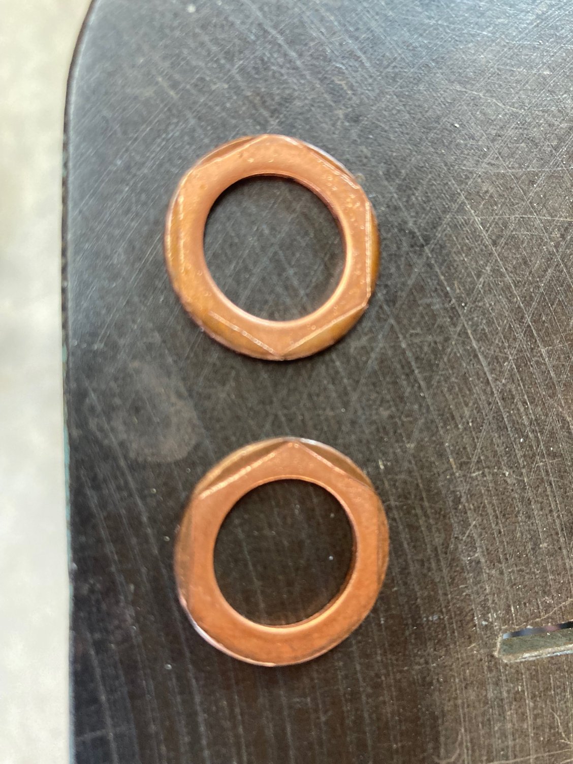 the pics below show the issue and the copper washers. You can see how even the impression on the second washer from the replacement pan is even