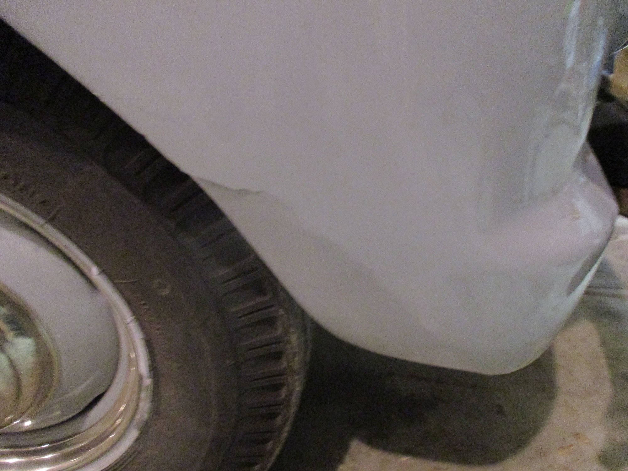 Fortunately, damage was limited to the passenger side lower fender. The picture doesn't show it too well, but there's a pretty good bend in it. I was able to pull it back into shape some, but the filler is definitely cracked. I'm thinking about a repo steel replacement. My fenders were in really bad shape before Bob (Jones) worked on them. Does anyone have any experience with the newly available 51-52 steel fenders available from Mid-Fifty? Thanks.
