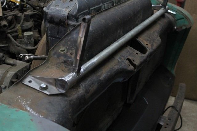 Time to make the end caps the cross bar pivots on, I cut a piece on 1/8" thick plate 2 1/2" x 5" and bent it in my vise then welded a piece of tubing 1" inside diameter x 1 1/4" long. I needed to clean out the inside of this tube with a grinding stone attached to my die grinder so the cross tube would pivot freely inside.