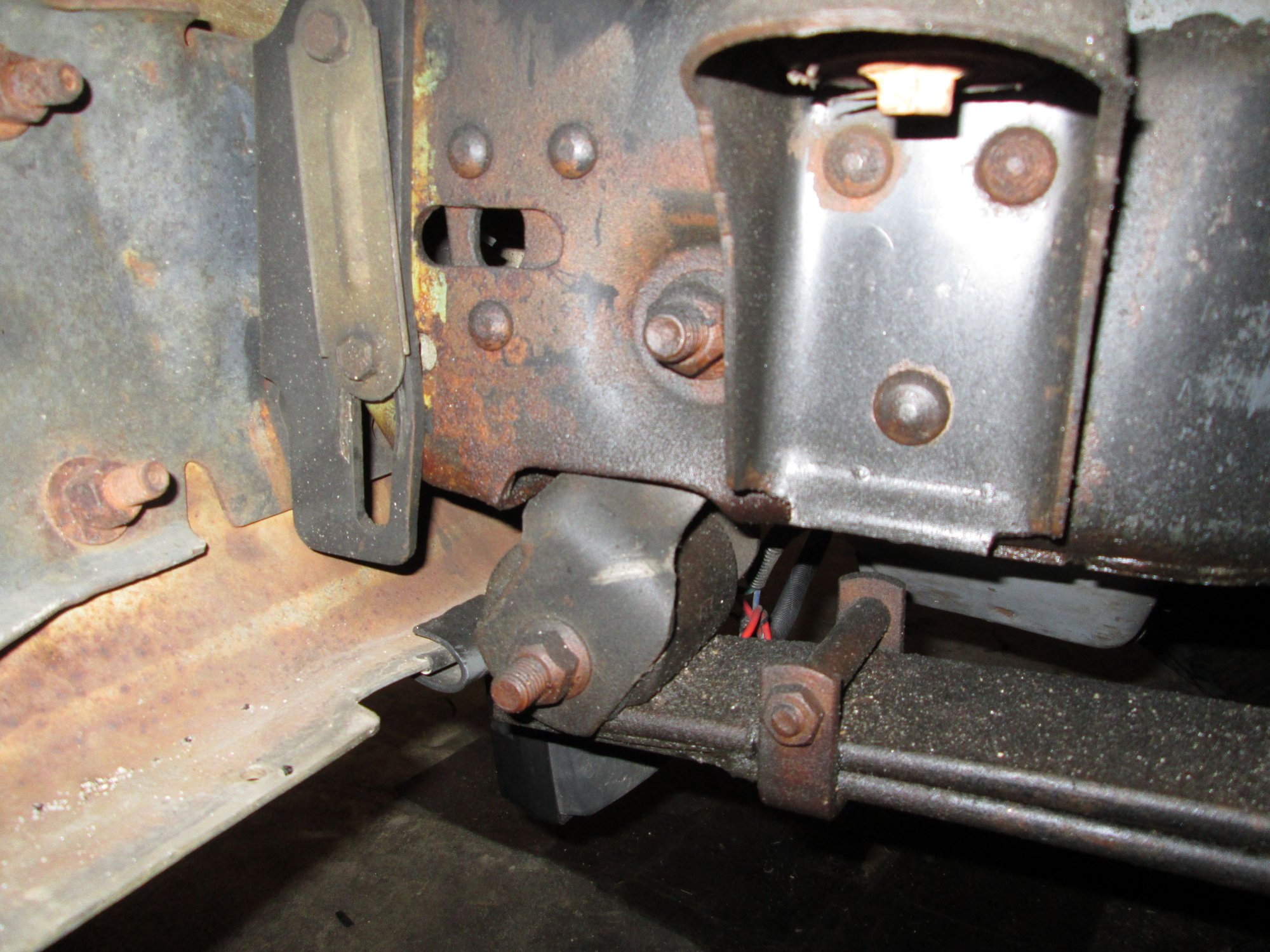 replaced that rear bushing on wednesday, rides and steers so much nicer. The outer wrap on the spring was hitting the spring hanger, that bushing was shot. Thought about this. If the spring was shot, and was sagging too much, it shouldn't be hitting the hanger, it should have pulled it back some from the end of the frame, being the straight eye to eye distance being shorter. A flatter spring (spring eye to spring eye distance being greater)would push the shackle closer to the frame.