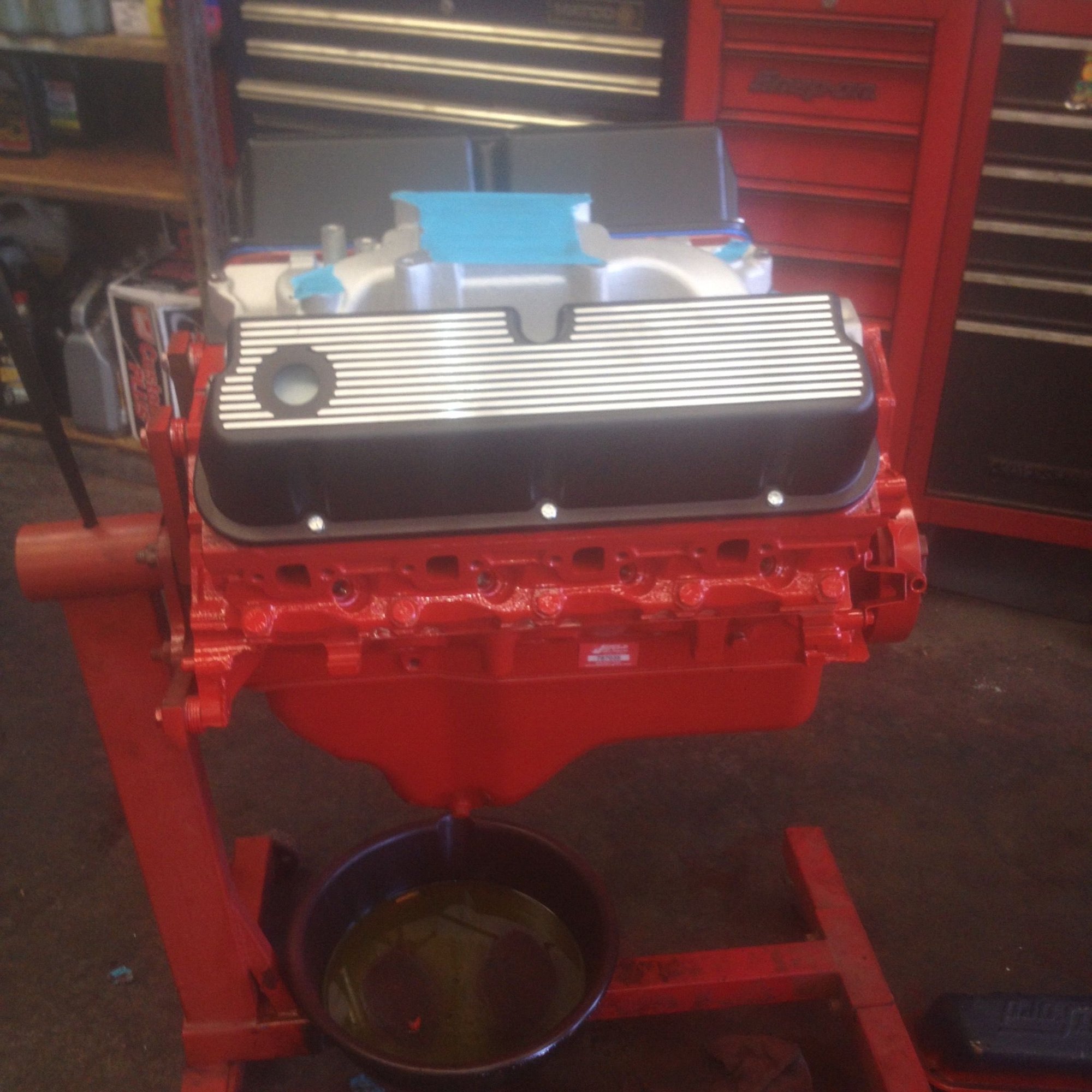 The truck moved back to Rose Automotive Repair where the engine and tranny had come in. Everyday the guys would send me pictures of what got done that day or just something interesting in the progress train on the truck. I decided to have the block painted red. I am not a purist on color. :-) But it is a Ford in a Ford. I hear the darkside has cookies but the force was strong on the distributor in the front. :-)