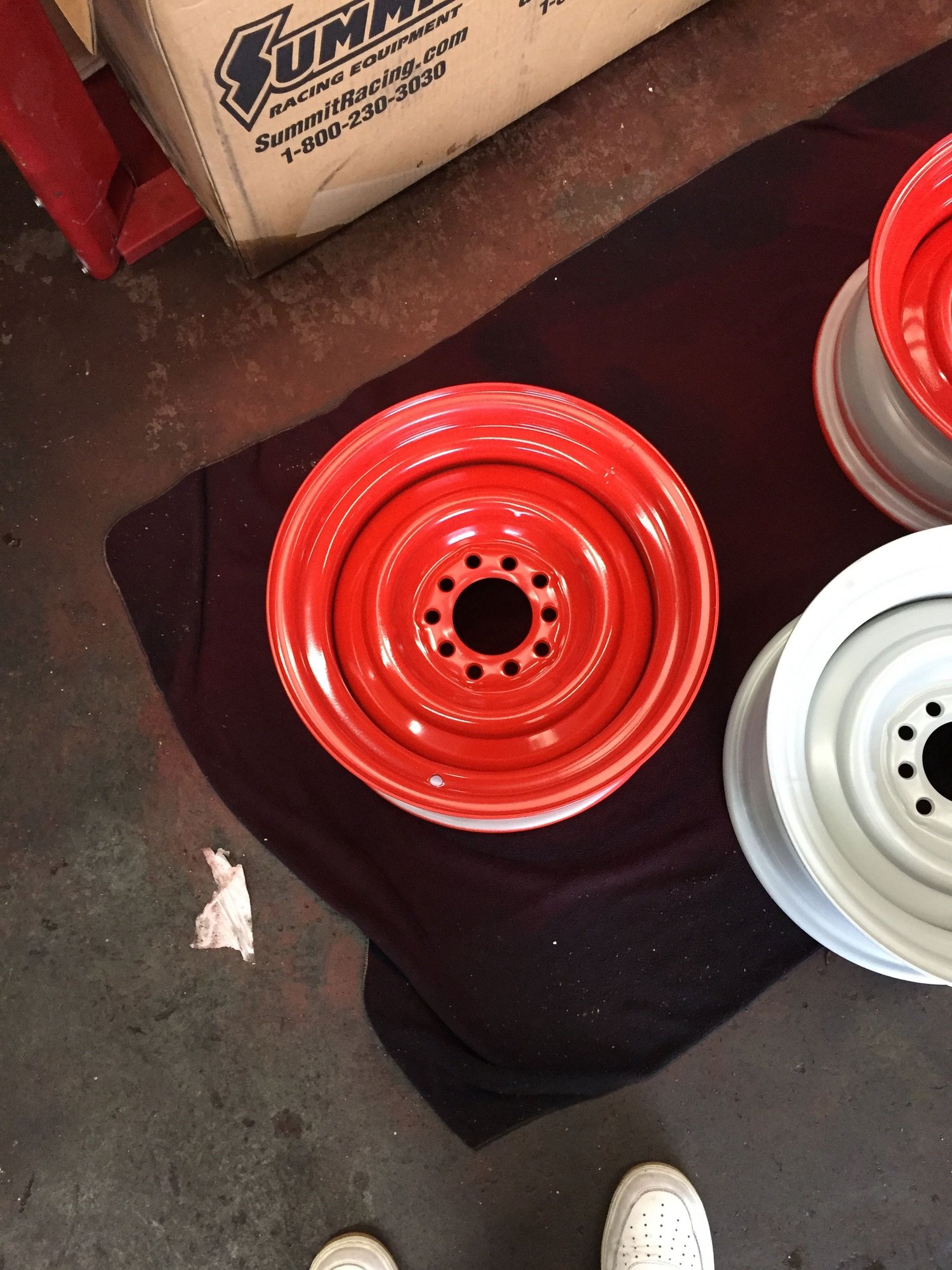 Knowing I had a decent set of tires on the truck wheels, I went the steelie route. I got some of the relatively cheap powder coated wheel vintique series 12's from Summit and the stainless caps for a 48 Ford. I am using the beauty rings that were on it when I got it. The wheels are the variety that have 10 holes. 5 holes are for the Ford 5x4.5 and the other 5 are for chevy. They are the 15x7 with a 4 inch backspace. These fit the tires that I have. They clear the calipers on the disc brakes in the front and back. They painted up Ford Red really nice and look great on the truck.