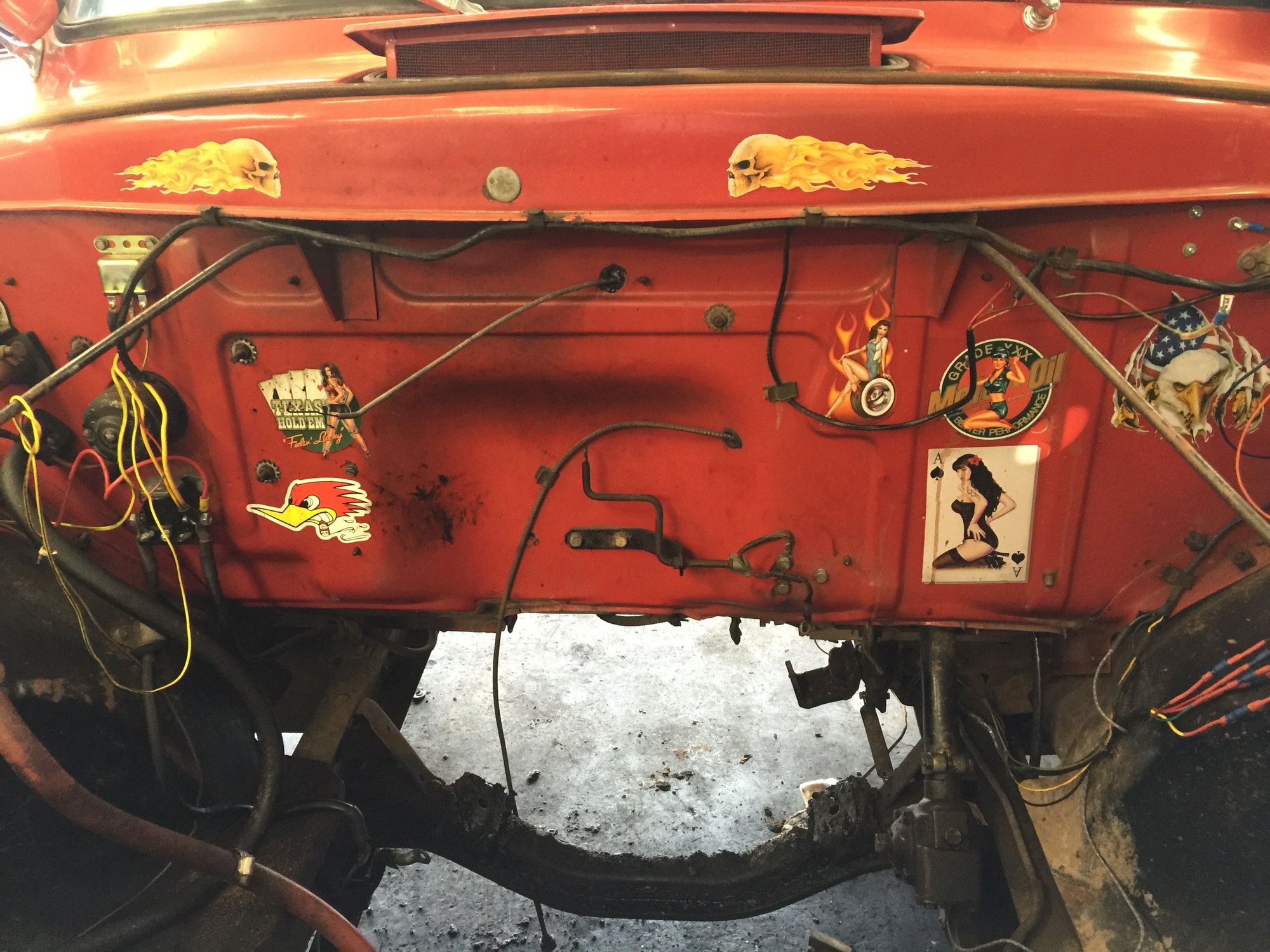 So when you do a Mustang II you need to yank the engine out. Learned that on the board. :-) Since I was going to put in a 302 and AOD that wasn't a big deal. One of the things I really like is the character of my truck. The stickers under the hood and on the firewall are part of that character and I wanted them untouched. The 239 and the 4 speed came out. I had takers for them, got them yanked out and then delivered her to the suspension shop. Unfortunately she sat there for 6 weeks longer than she should have. But the install turned out nice.