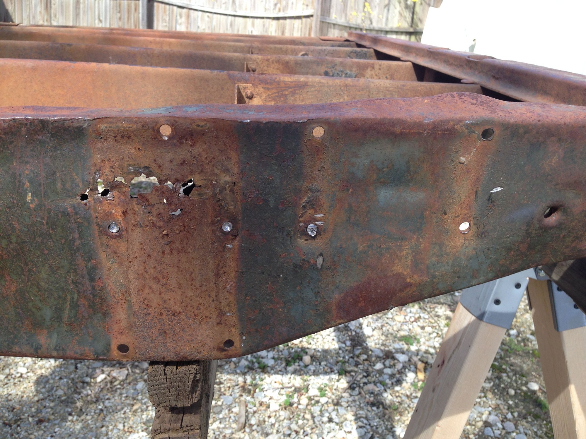 I drilled out the rivets on the back side. Under the frame rail brackets there was some rust through. I will be looking into seeing if I can get it replaced. I'm beginning to think that piece was replaced at some time.