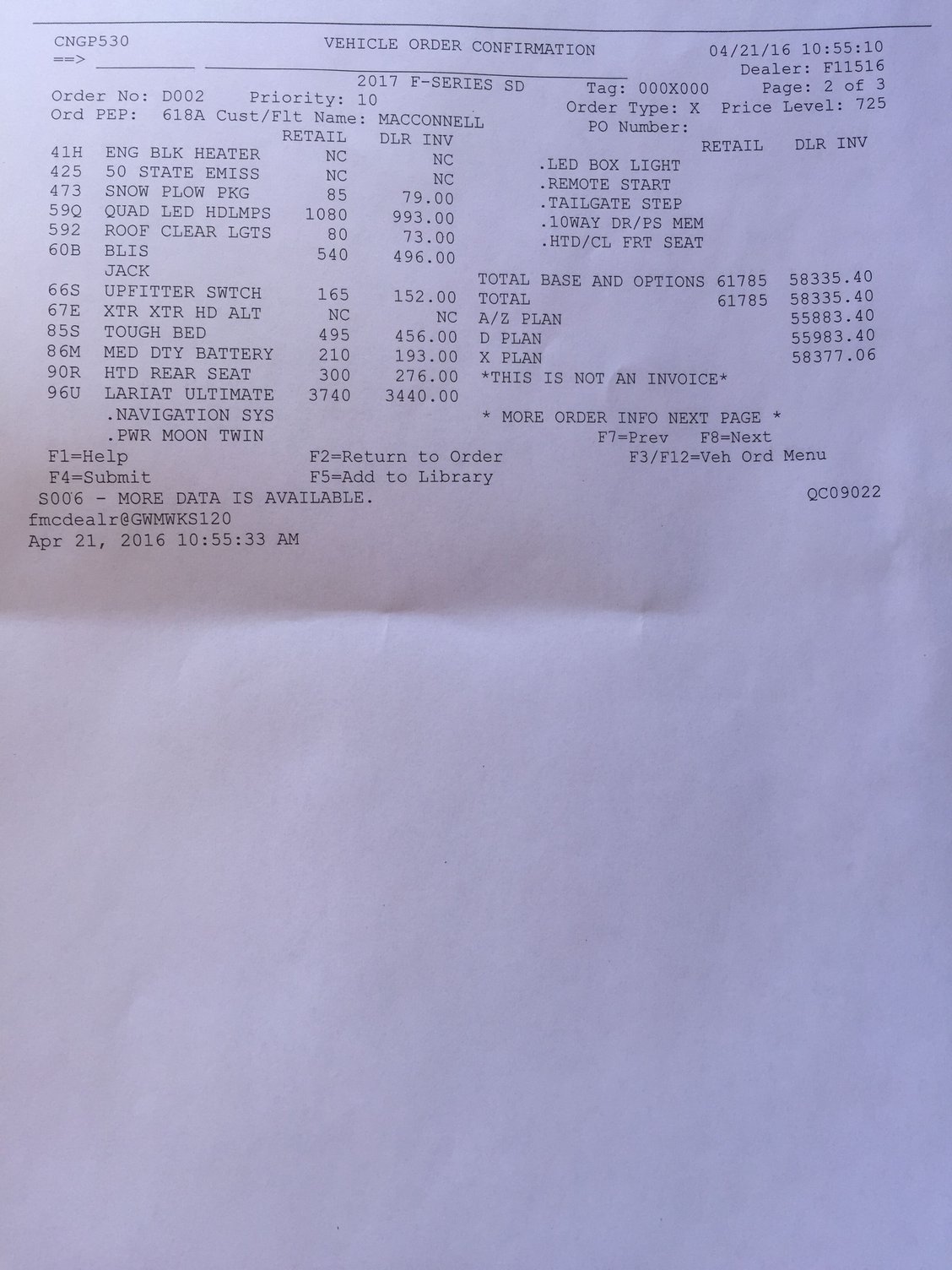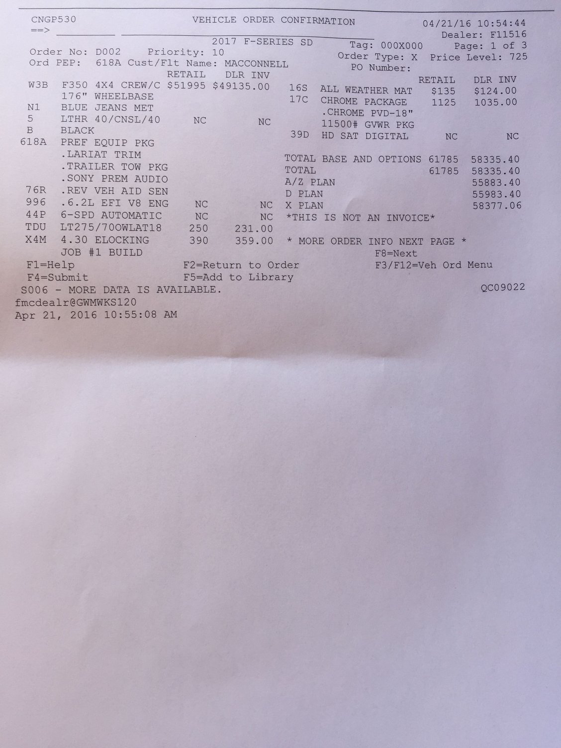 I'm ordering an XL. I'll put the whole sheet up later, but the base price on my sheet for an F250 4X4 super cab is 37670 retail 35598 invoice.