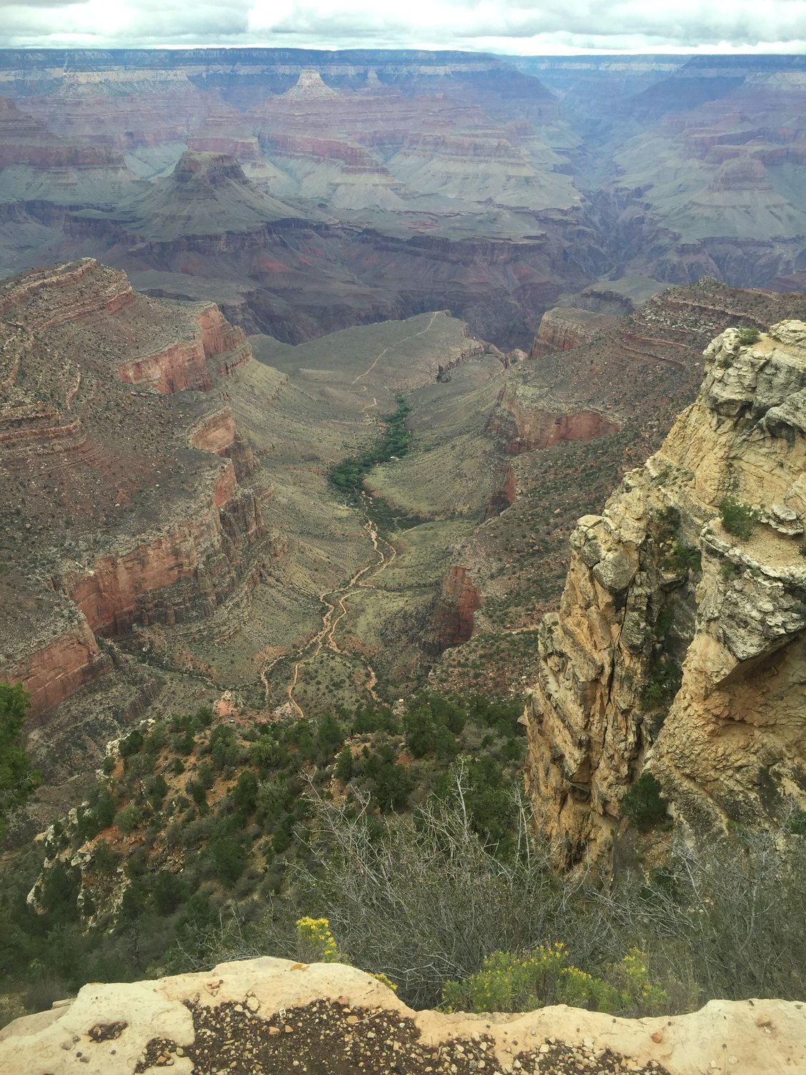 And here's a shot of part of the trail we rode. The clump of green is Indian Gardens part way down, and then the trail goes out to a point where it drops, almost literally, into the inner canyon.