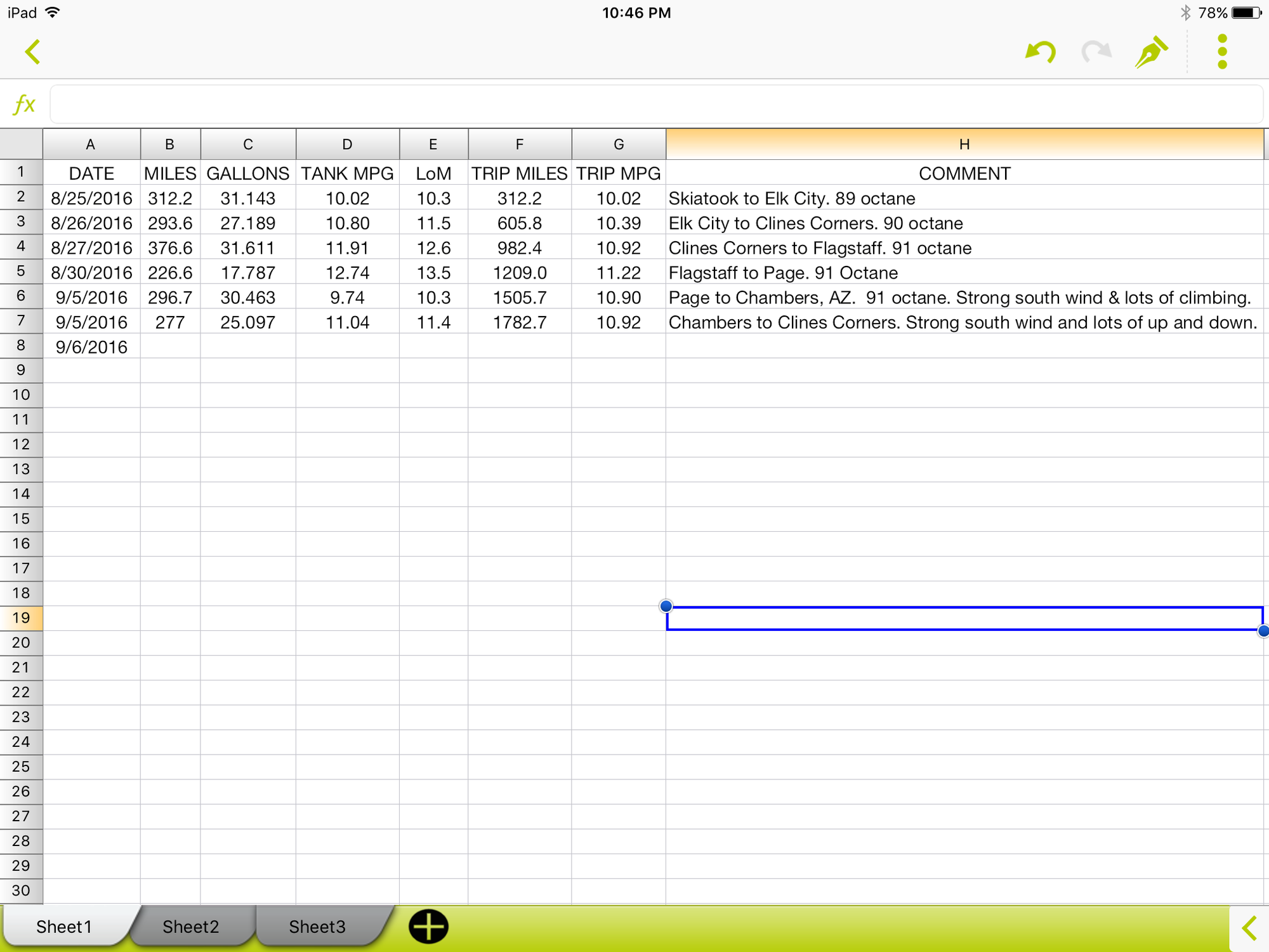 We are well on the way home, and should be home tomorrow afternoon. I think the spreadsheet below shows the MPG, both by-tank as well as for the trip.