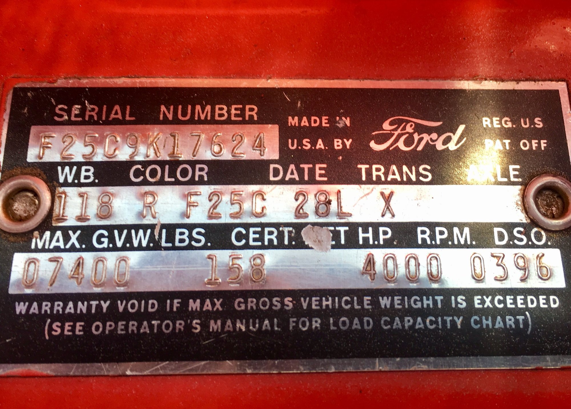 F25C9K17624 / WB: 118 / COLOR: R / MODEL: F25C / DATE: 28L / TRANS: X / AXLE: Blank (DSO)* / MAX GVW LBS: 07400 / CERT NET HP: 158 / RPM: 4000 / DSO: 0396