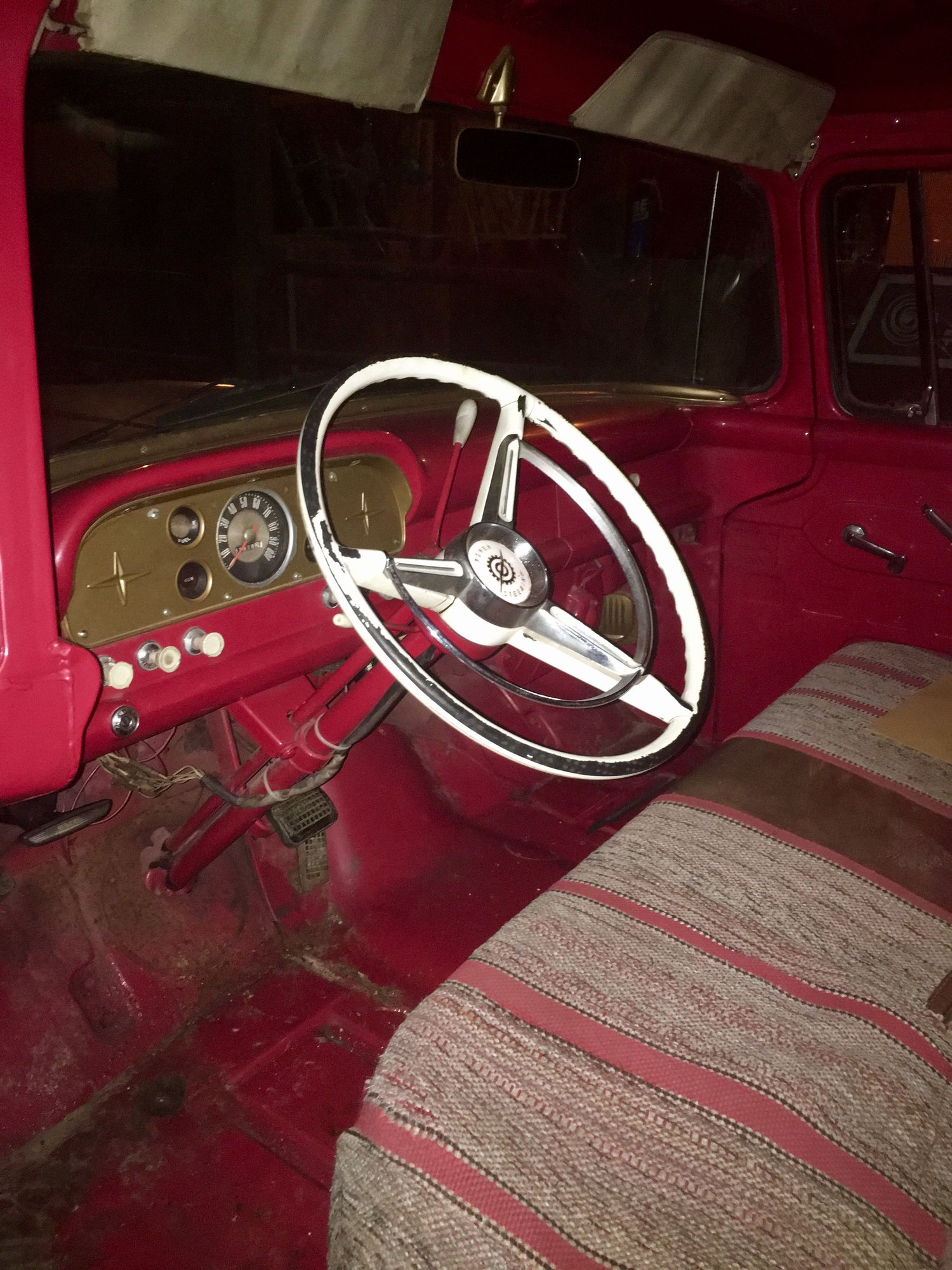 Thank You WB! Here is a picture of the whole steering wheel (pardon the seat - another battle to come). The canister is indeed the p/s fluid canister - the plumbing beneath it is on the agenda this weekend along with the water pump. Will get the steering wheel off and get that information! Appreciate the help greatly!