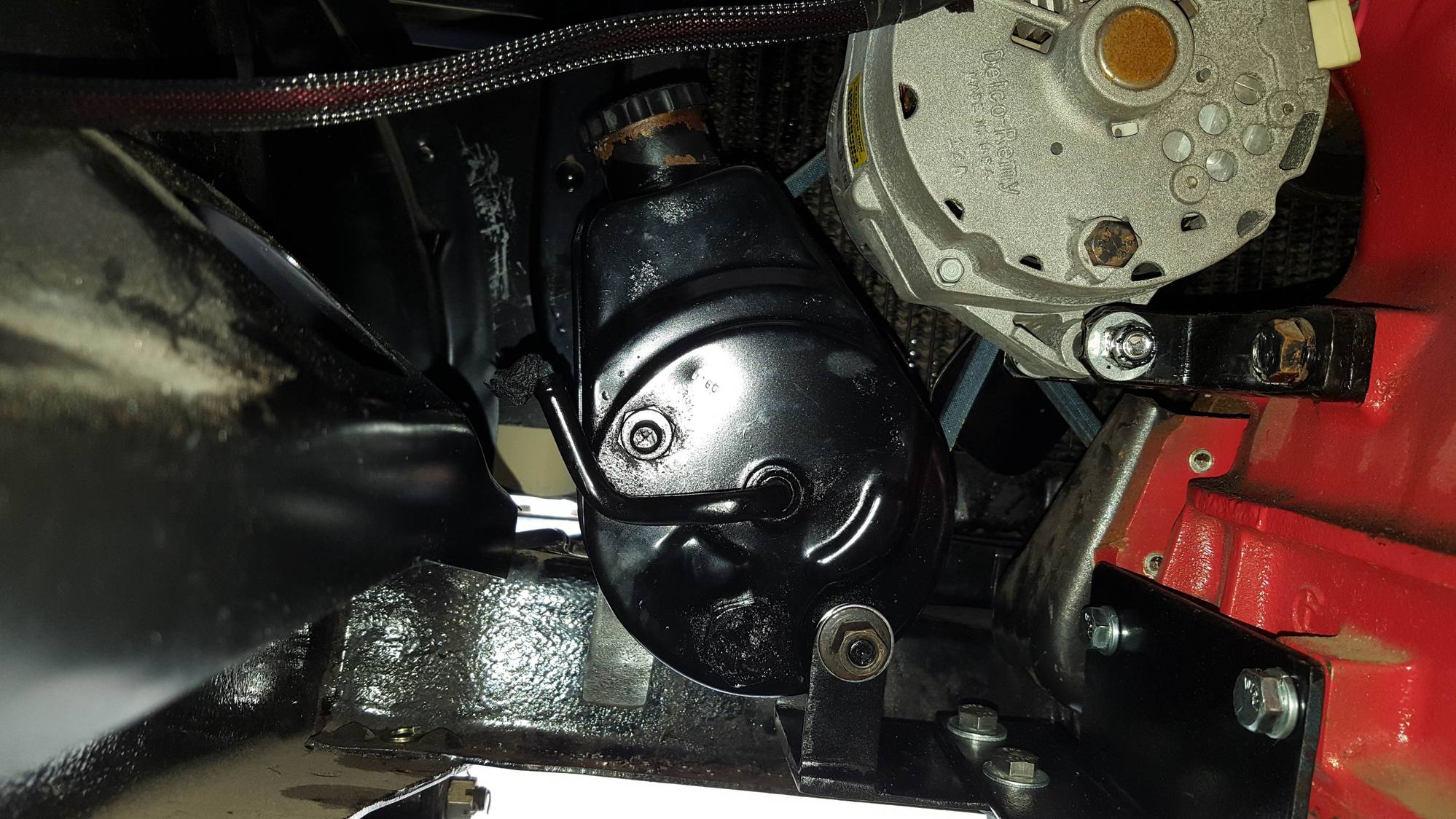 Decided that I wanted to add power steering to my truck. Picked up a "canned ham" pump and reservoir from my local U-pull it yard. Used pic I found on this site to make a bracket for it. Finally got it done.
