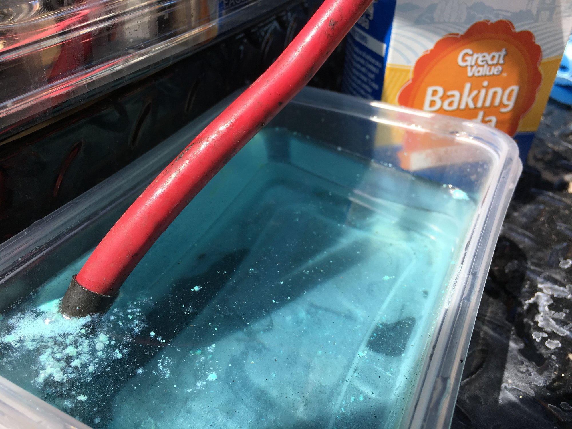 With the cables cut, I cleaned them using Vinegar and then a water/baking soda solution to naturalize the acid. This cleaned the cable nicely and prepared them for the new terminal ends.