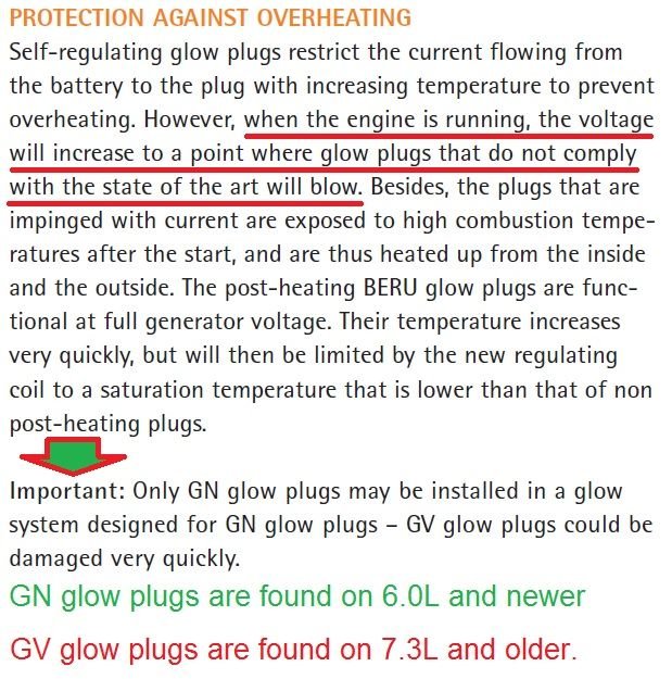 So I'm not sure that the risk of a potentially curtailed life of glow plugs as a result of a high amp single alternator installation can ever be confirmed... but based on Ford's service bulletins and factory service manual, and based on Ford fitting a passenger car alternator to the 7.3L diesel, while engineering and casting an entirely new front bracket for a second alternator, and based on Ford specifically keeping that second alternator TURNED OFF during the glow plug cycle, and ONLY during the glow plug cycle, and based on Beru's information and description of their various generations of glow plug design, I am inclined to believe that the risk exists, regardless of whether or not any owner is able to confirm it.