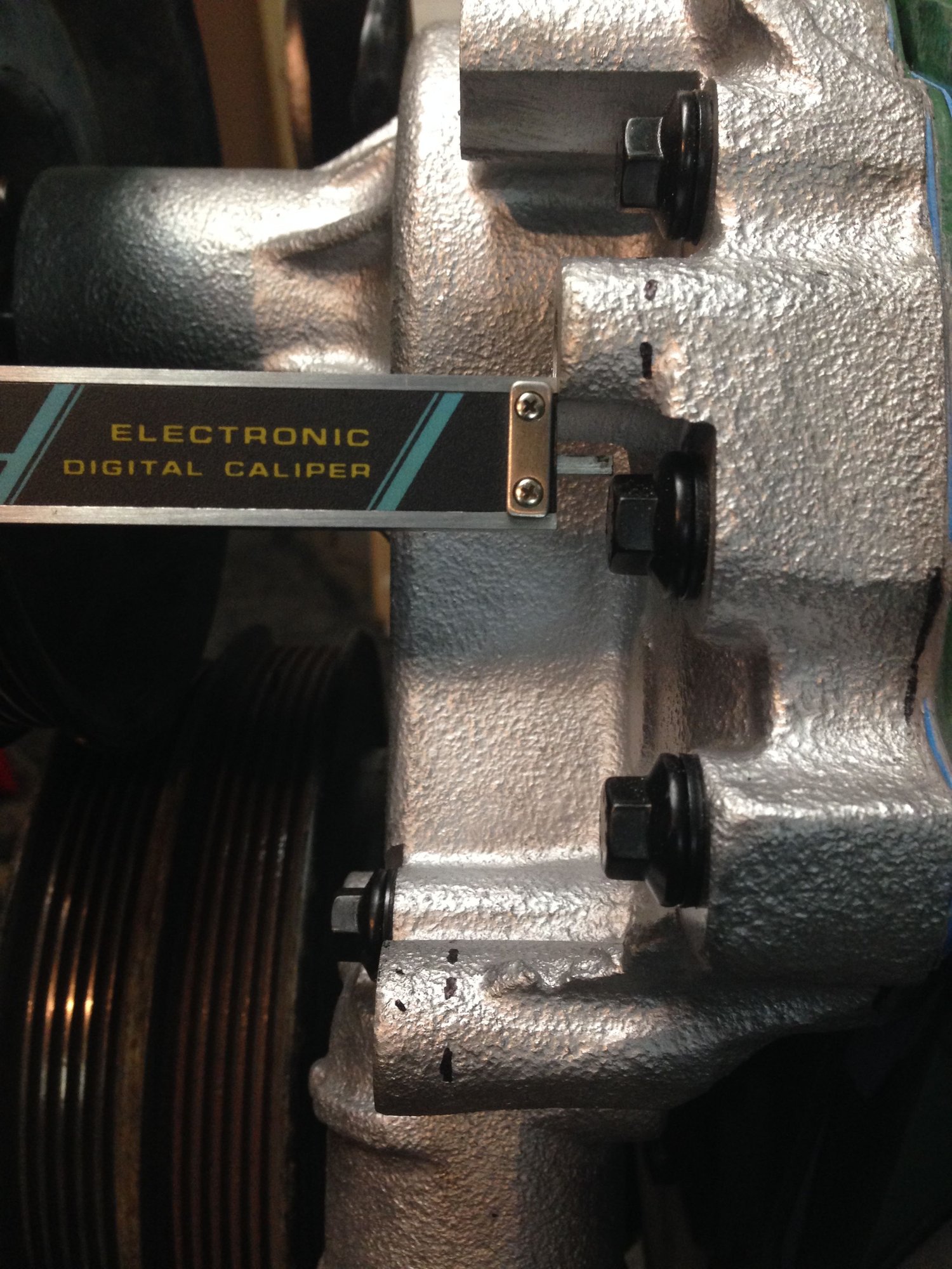 Next, mark the mounting tabs for exactly what you CAN remove without affecting the bolts behind the power steering bracket (mark them for 0.240” using your sharpie and your caliper).