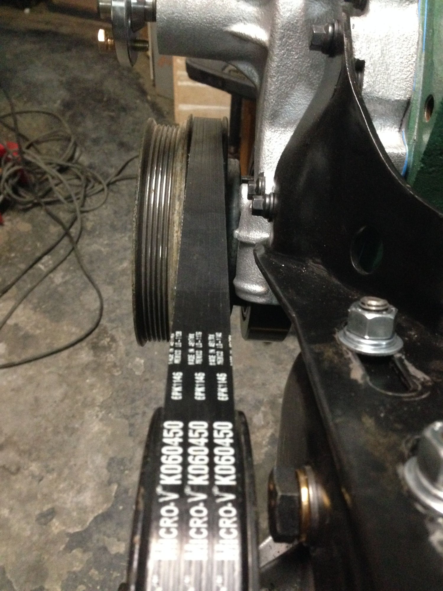 When tightening everything down, make sure you’ve got the power steering pump and alternator in a position where you still have some clearance to release them and move them downwards (to release your future serpentine belts). You don’t want to order short belts, have a hard time getting them on, and then have an impossible time getting them off. That’s what happened to me when I had a belt that was too short on the alternator – ended up pulling the water pump pulley off the motor to get the belt off.