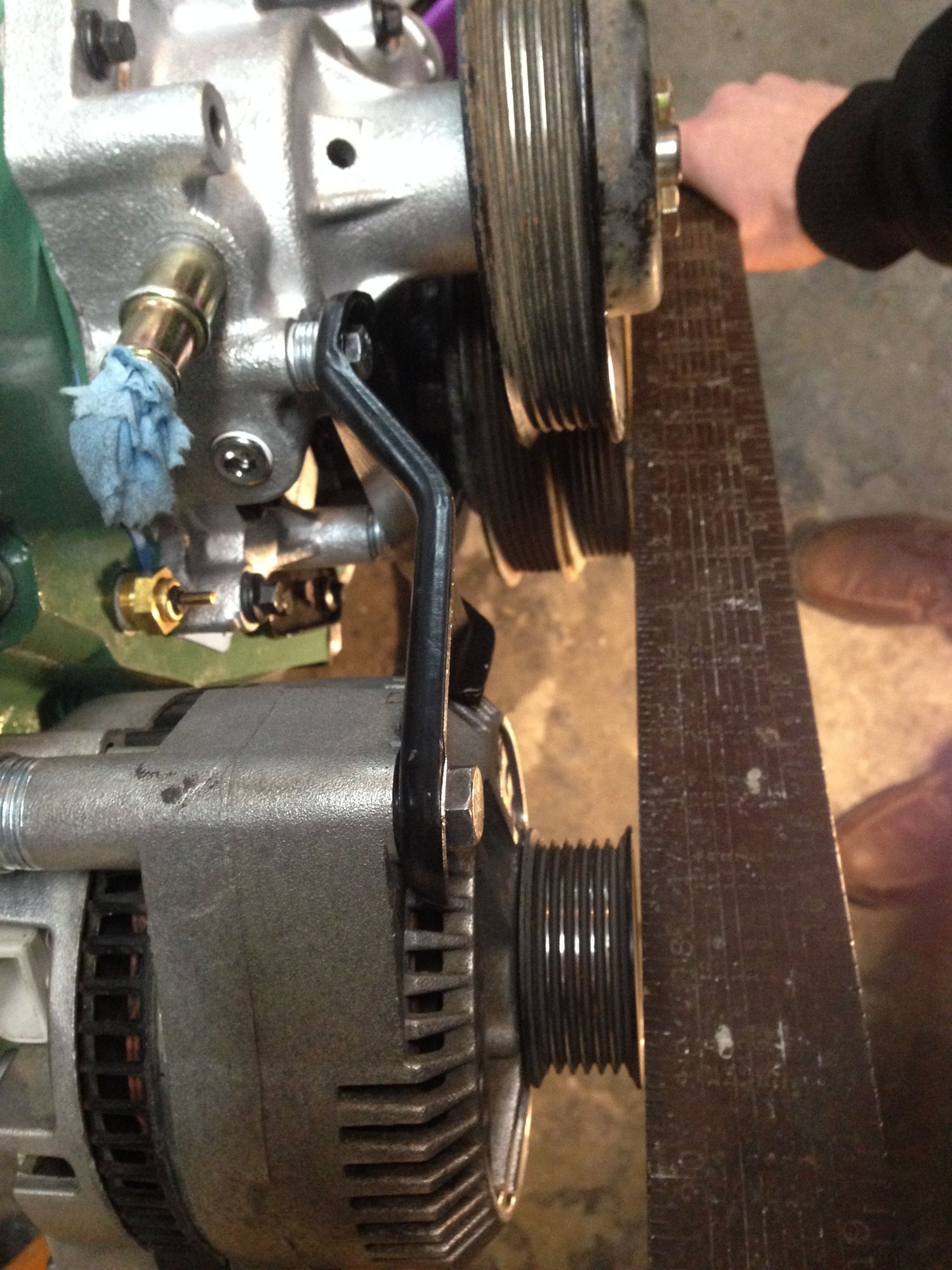 Once it’s all nicely aligned, grab your square and check it against the crank. My waterpump was 0.025 further out than the crank, so I used the crank ONLY when checking alternator alignment.