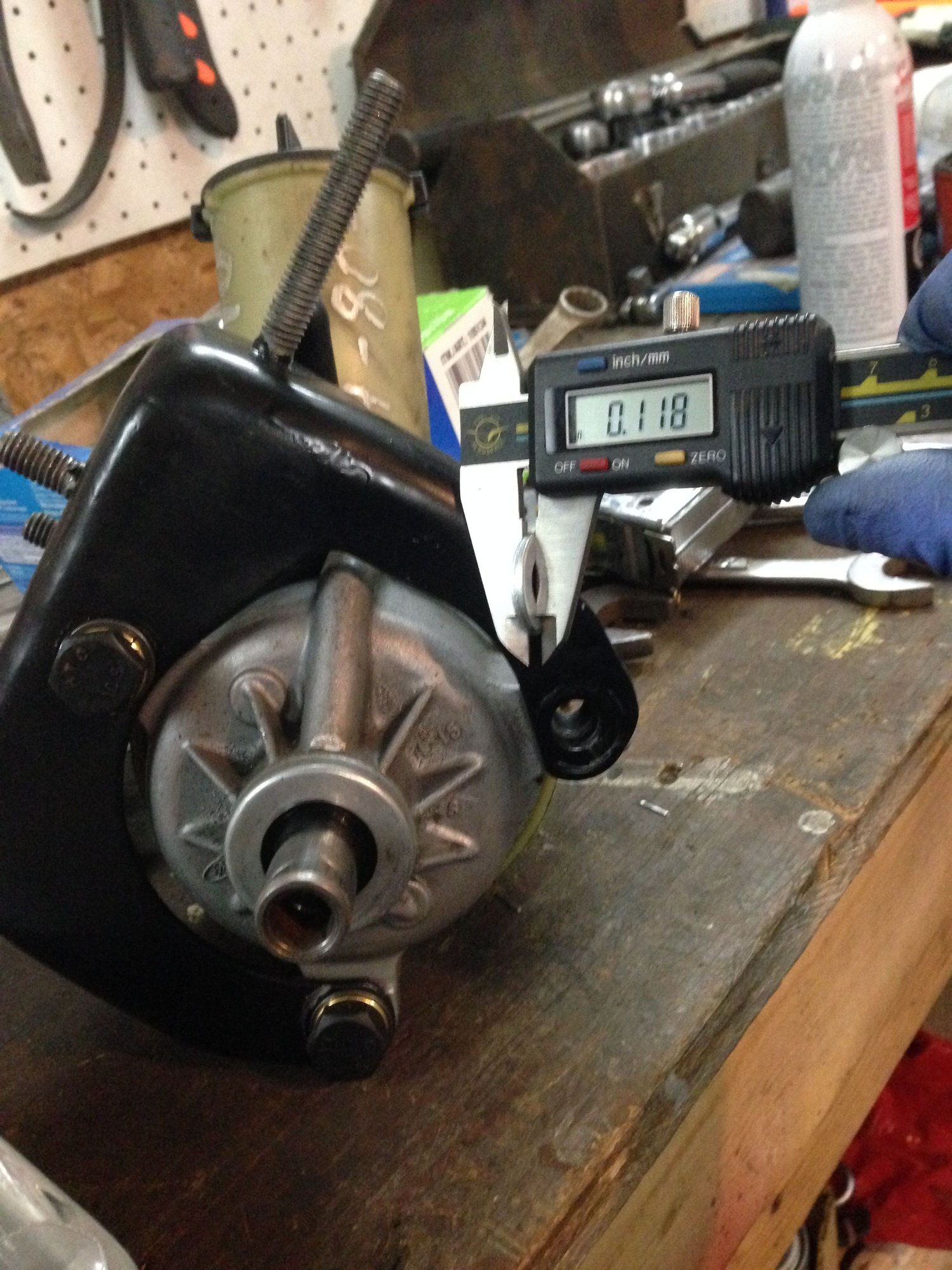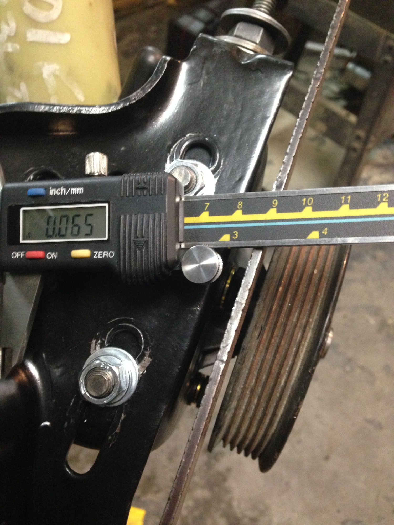 I threw my square back on, and measured that I had more than 1/8” to go at this point. I didn’t practice what I am preaching because I didn’t write this number down. If I recall correctly, it was something like 0.198. This was likely because I had changed so many geometries and angles with the bracket and pump that the measurement was different than expected. It could also be from the fact that I never used a helper to keep the square tight against the crank.. I held it with one hand… measured with the other hand, and somehow took a photo too.