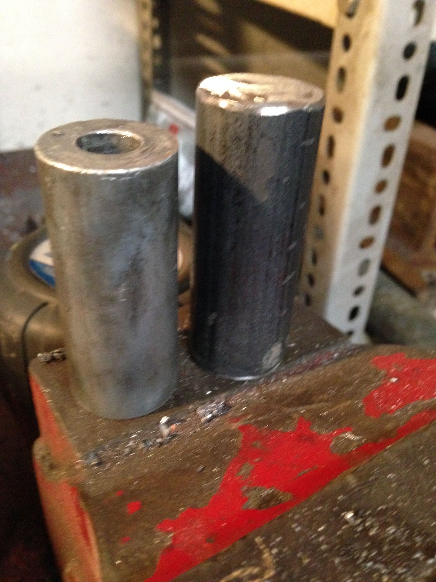 In total, I ended up with a shim that was 2.625" (2-5/8") long, and drilled for a 29/64” hole (slightly larger than 7/16). The OEM (stock shim) is 2.34375" (2-11/32") long, and is too short for this application. I chose NOT to use washers + the OEM shim because that seemed hokey to me. For the amount of effort required, the steel round stock shim works very well and is highly recommended.