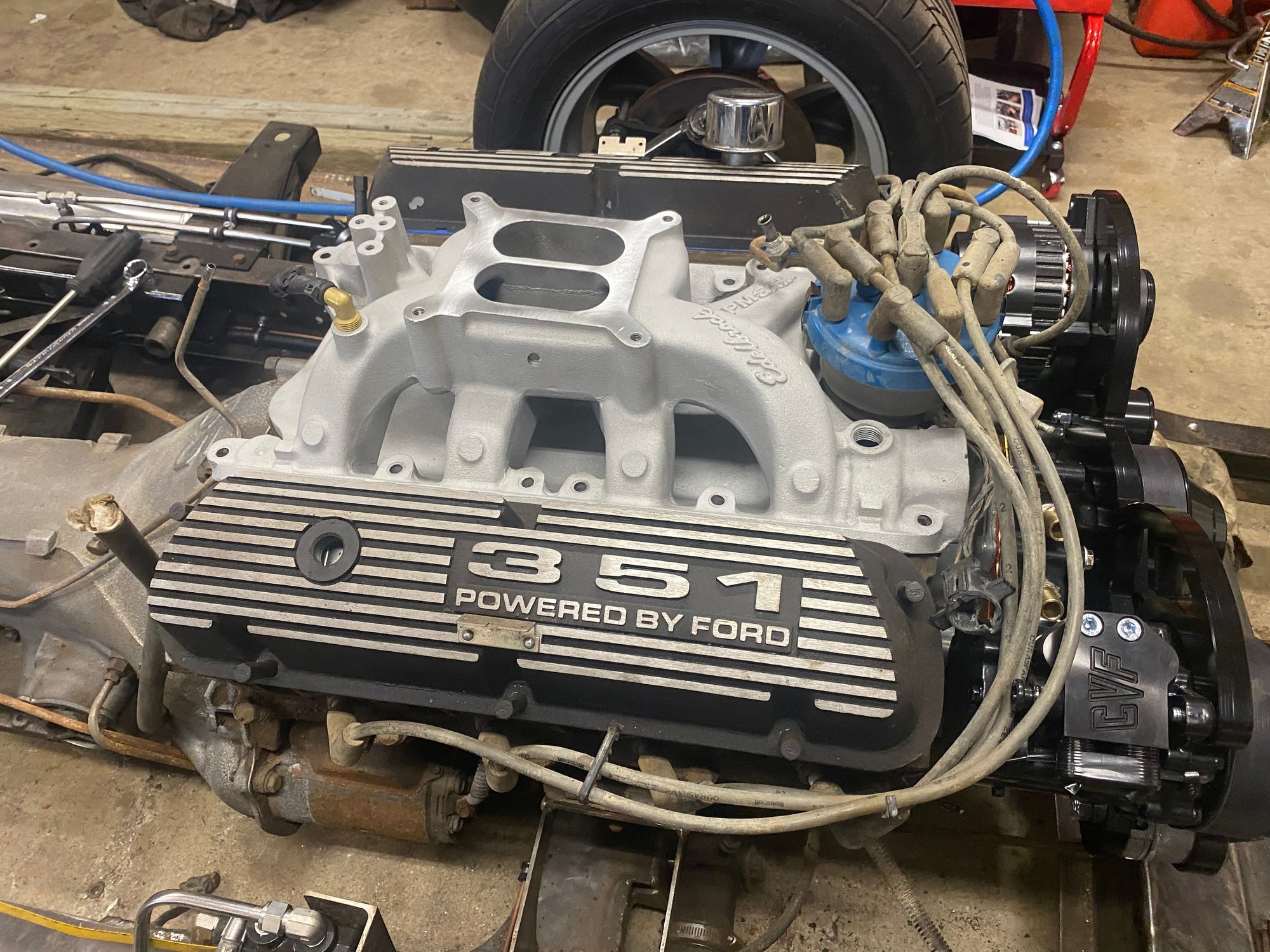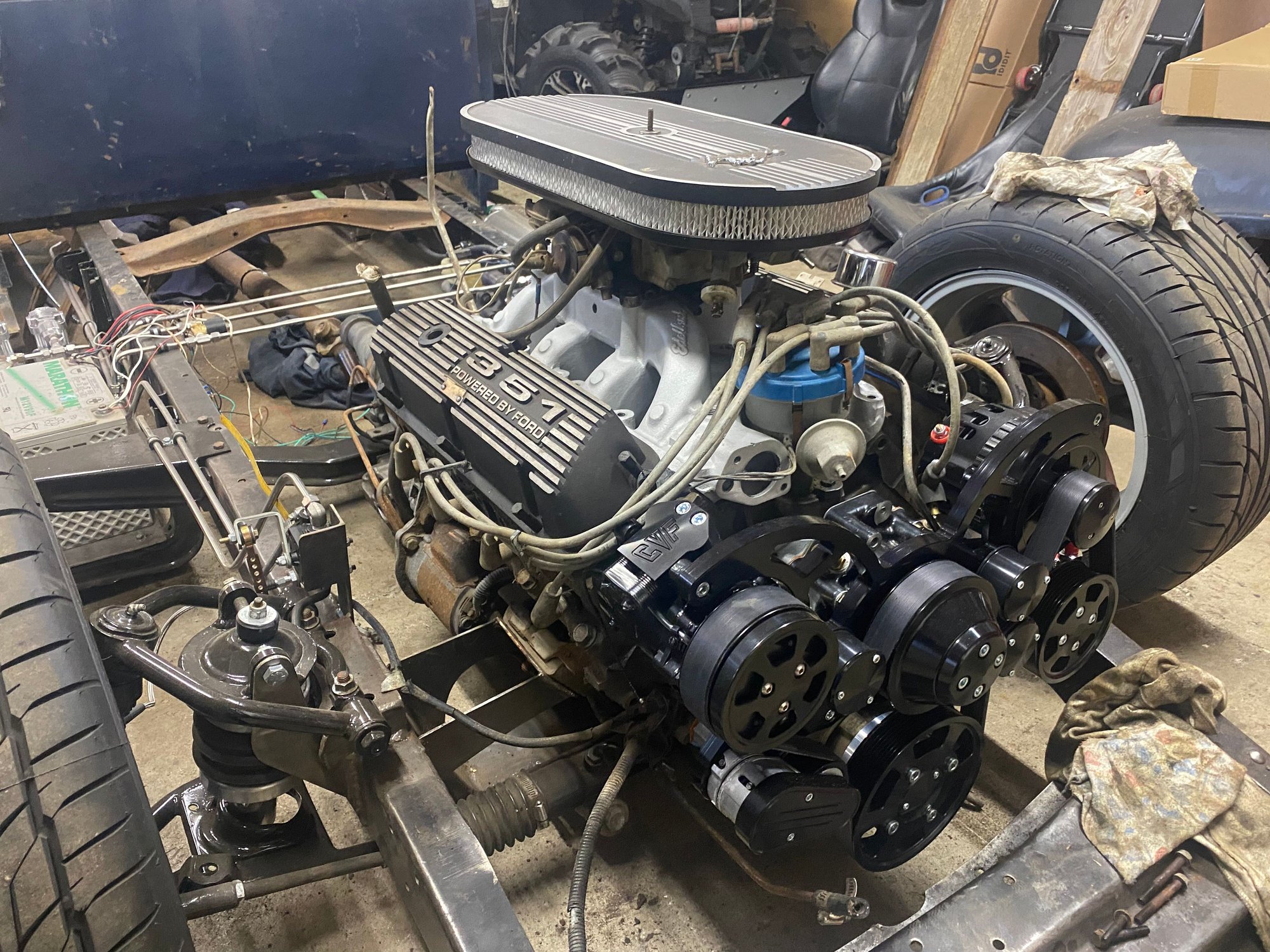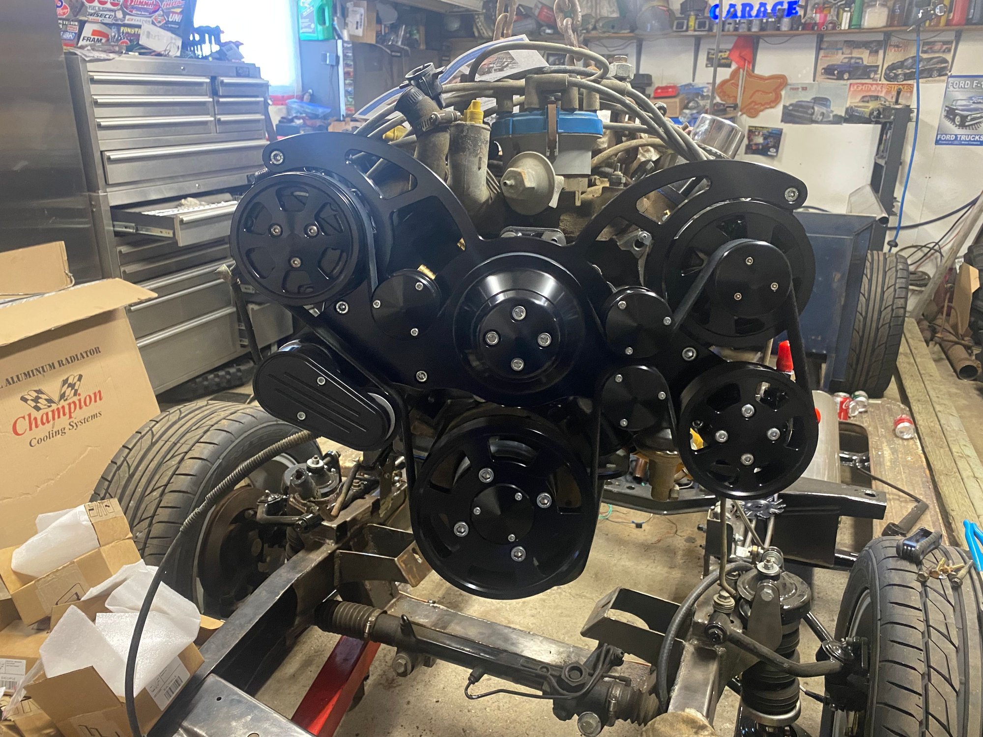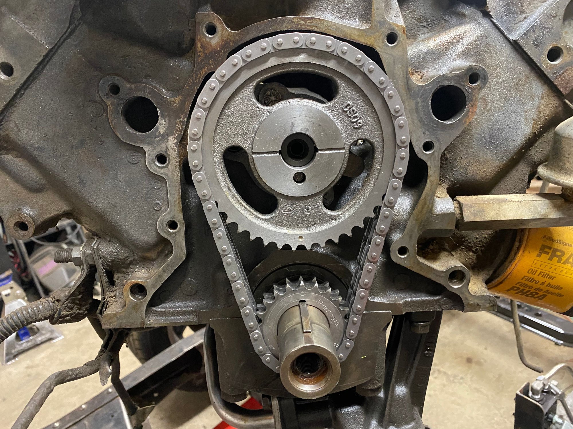 Installed a new timing chain and gears. Then proceeded to install the CVF racing serpentine belt kit. Had some issues getting the belt on, but it’s all together now. I also pulled the original intake off and put on the edelbrock air gap that I bought at Christmas time. I don’t have it bolted down yet. Now I need to figure out if it’s worth it to try and fix and rebuild this old carb or upgrade to a new 750