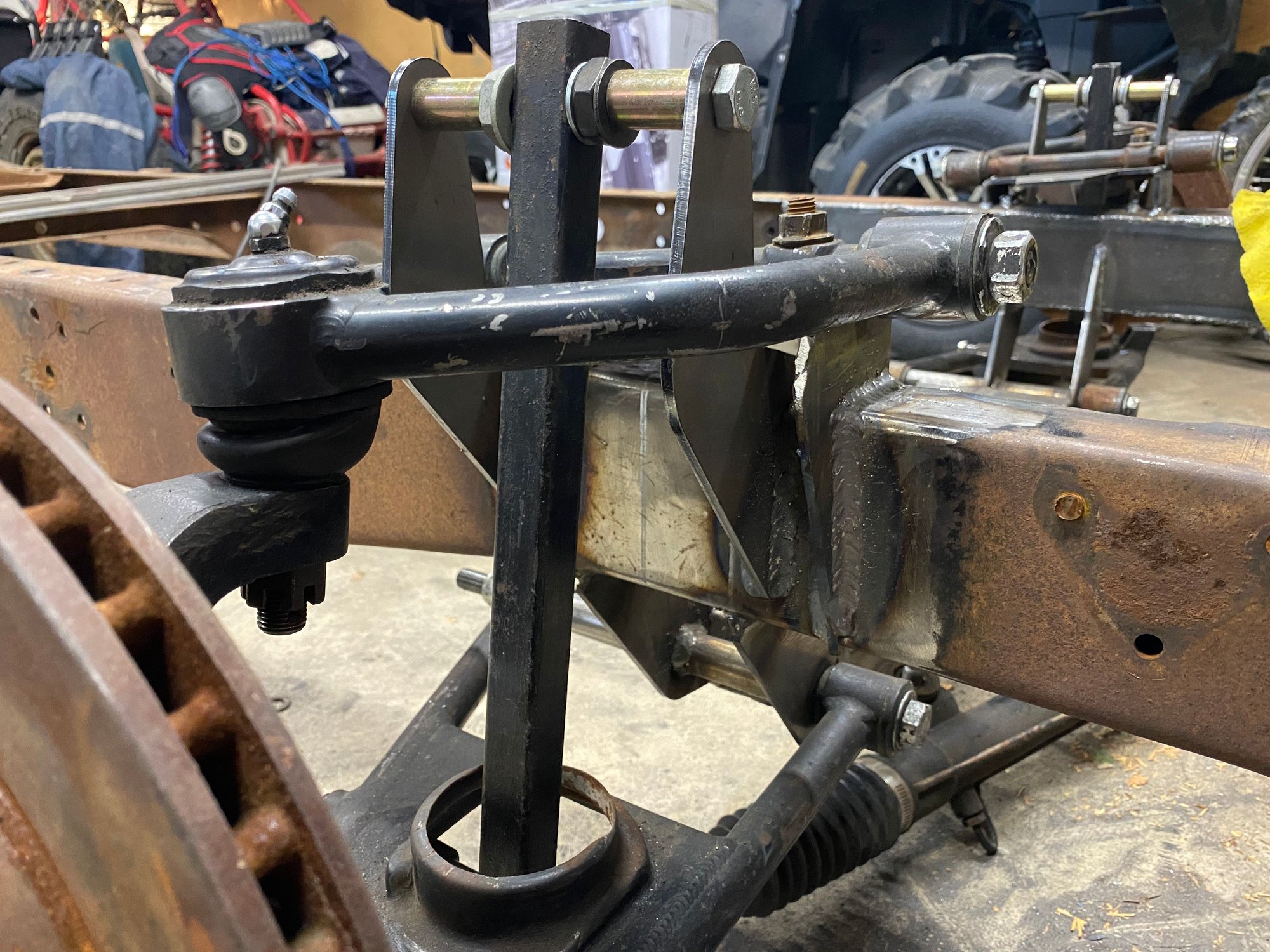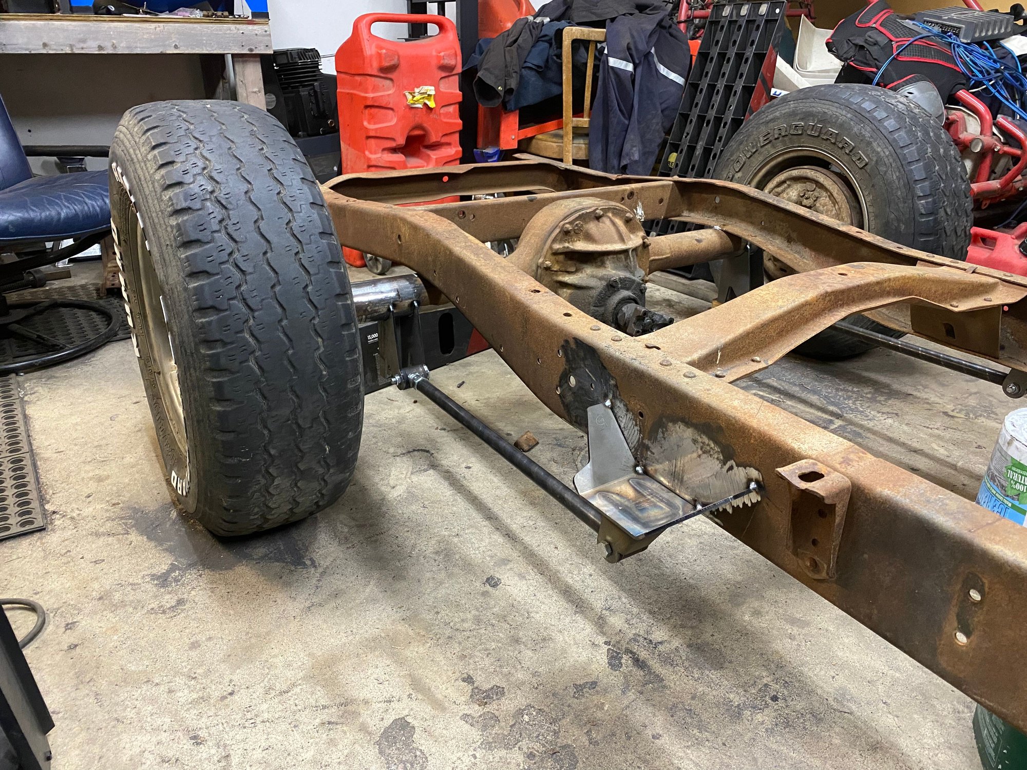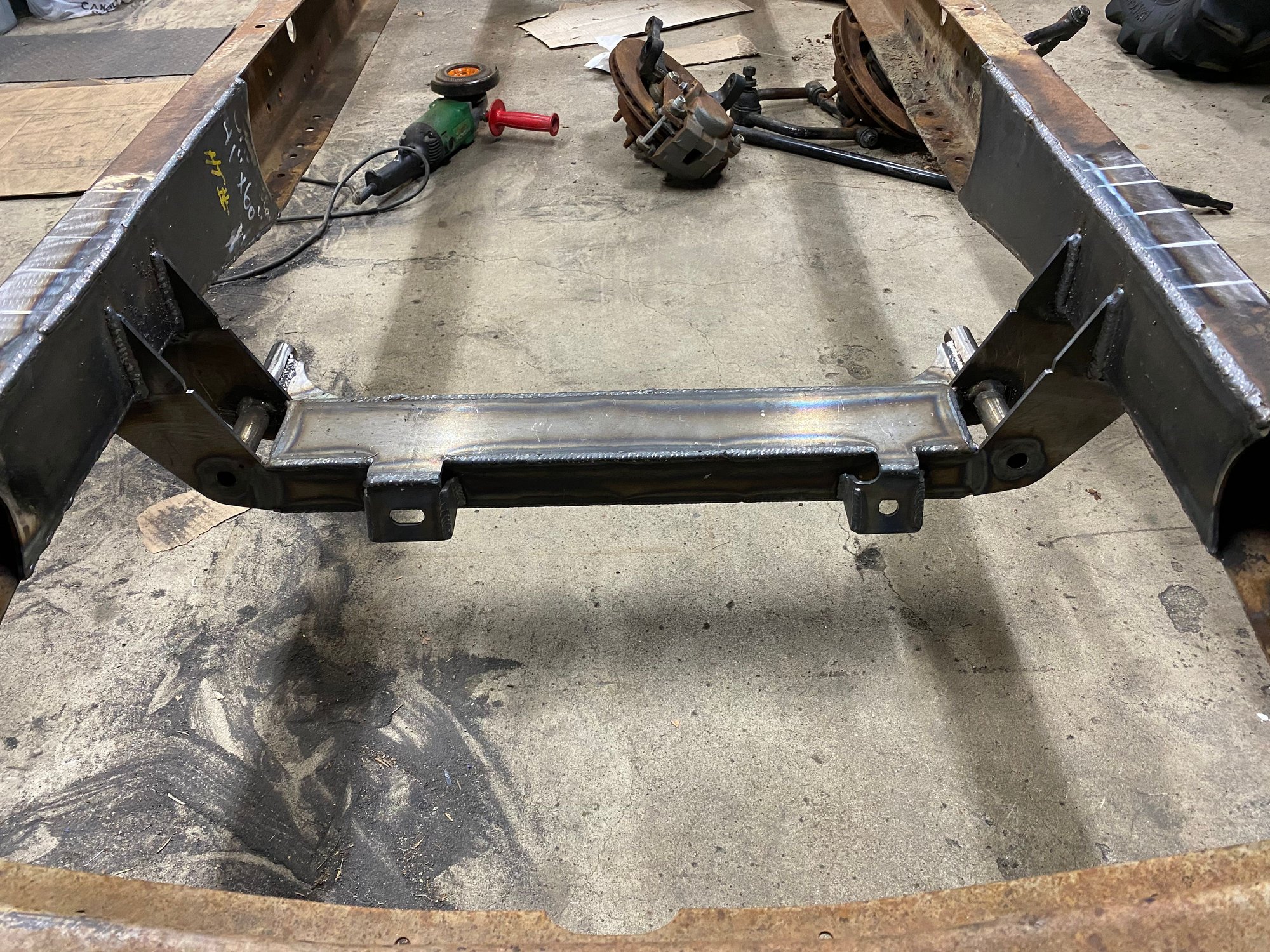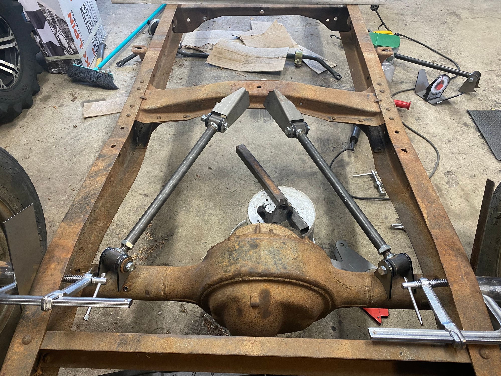 Redid the rear bottom links. Moved them to inside the frame. Where I had them I wasn’t going to be able to put the shocks on. I could of went farther out but I jumped the gun and welded the front anchor mounts. Im not using that crossmember for the upper mount. Just needed something to mock it up with. But will be making something very similar