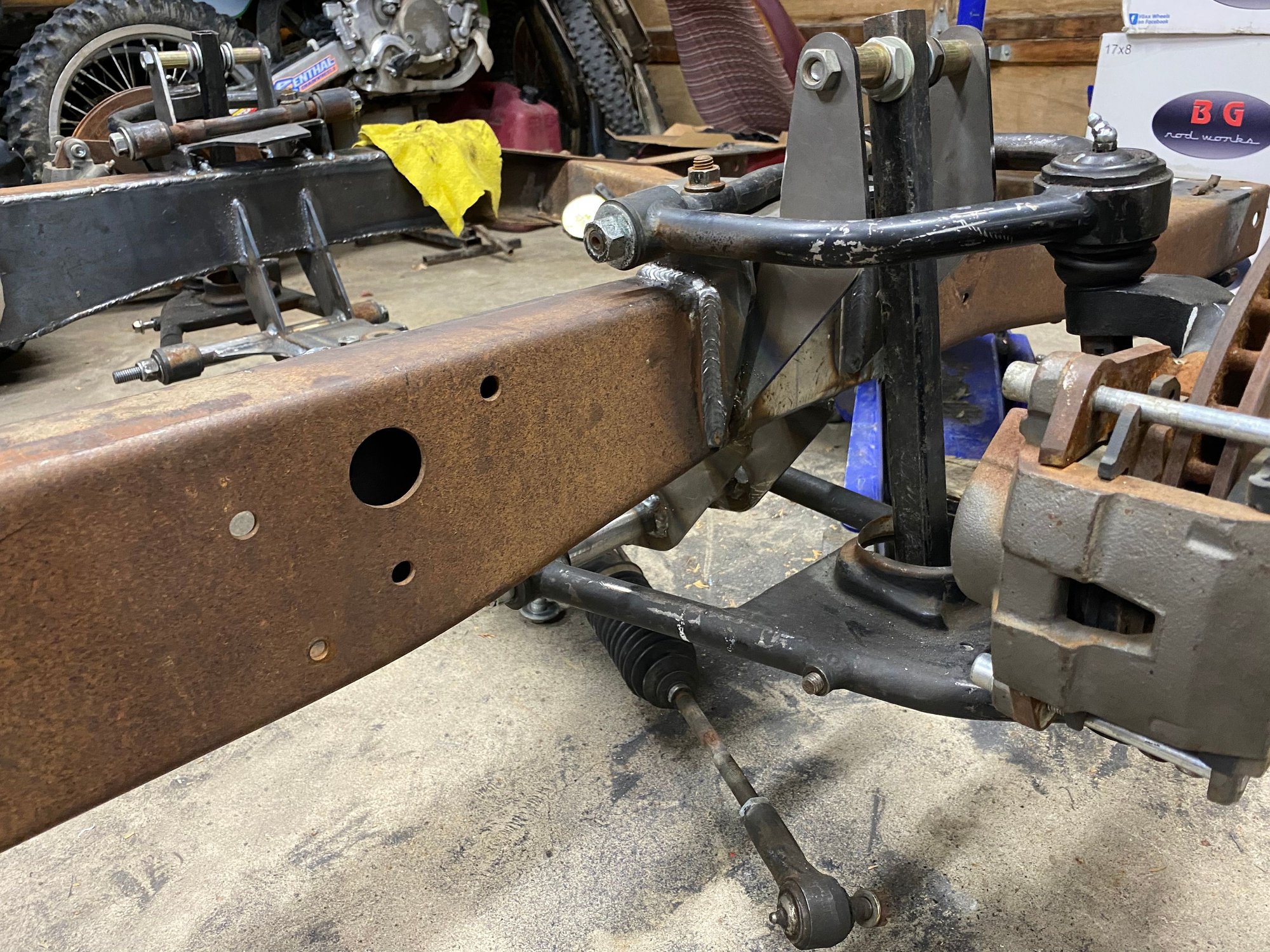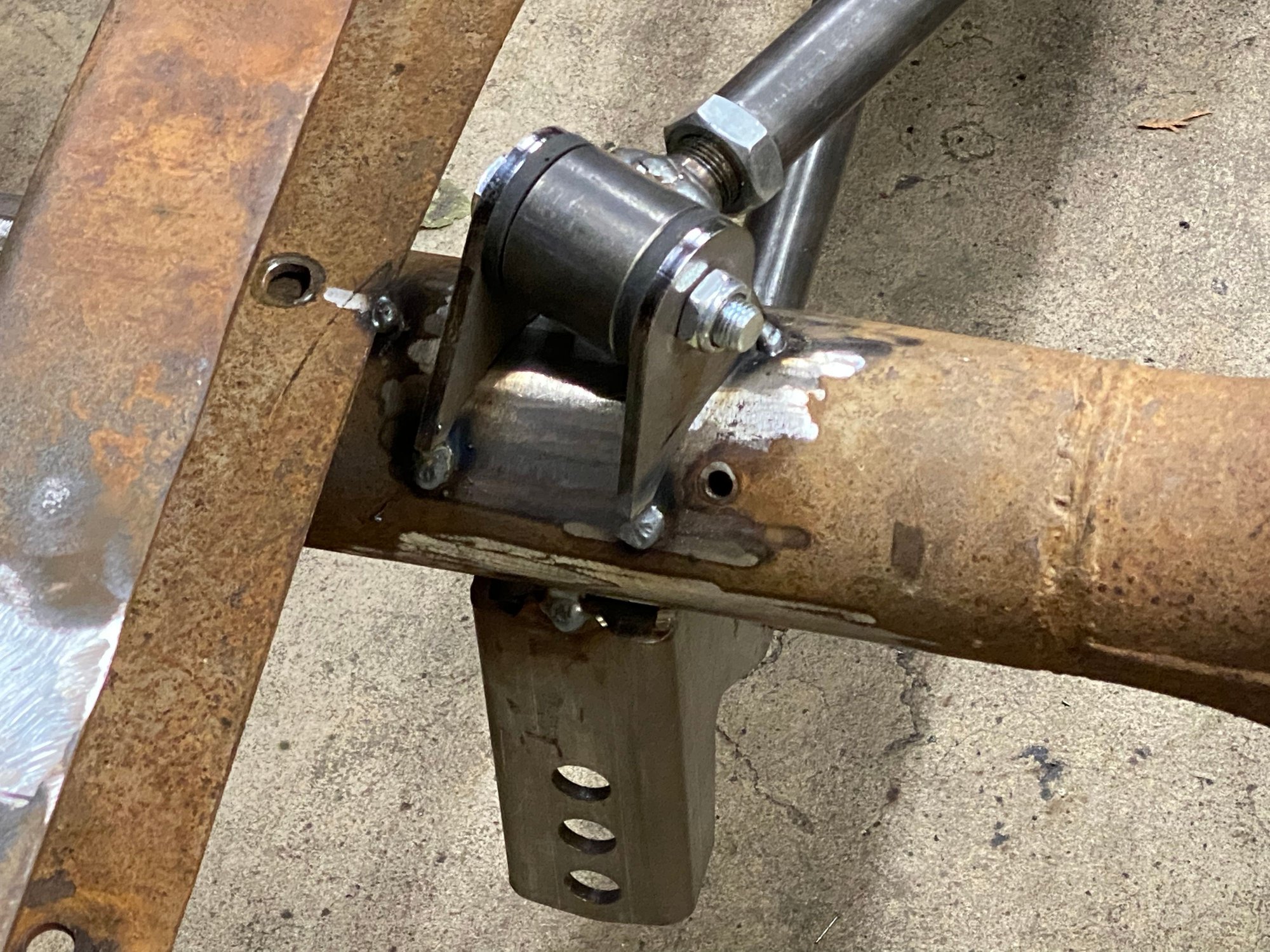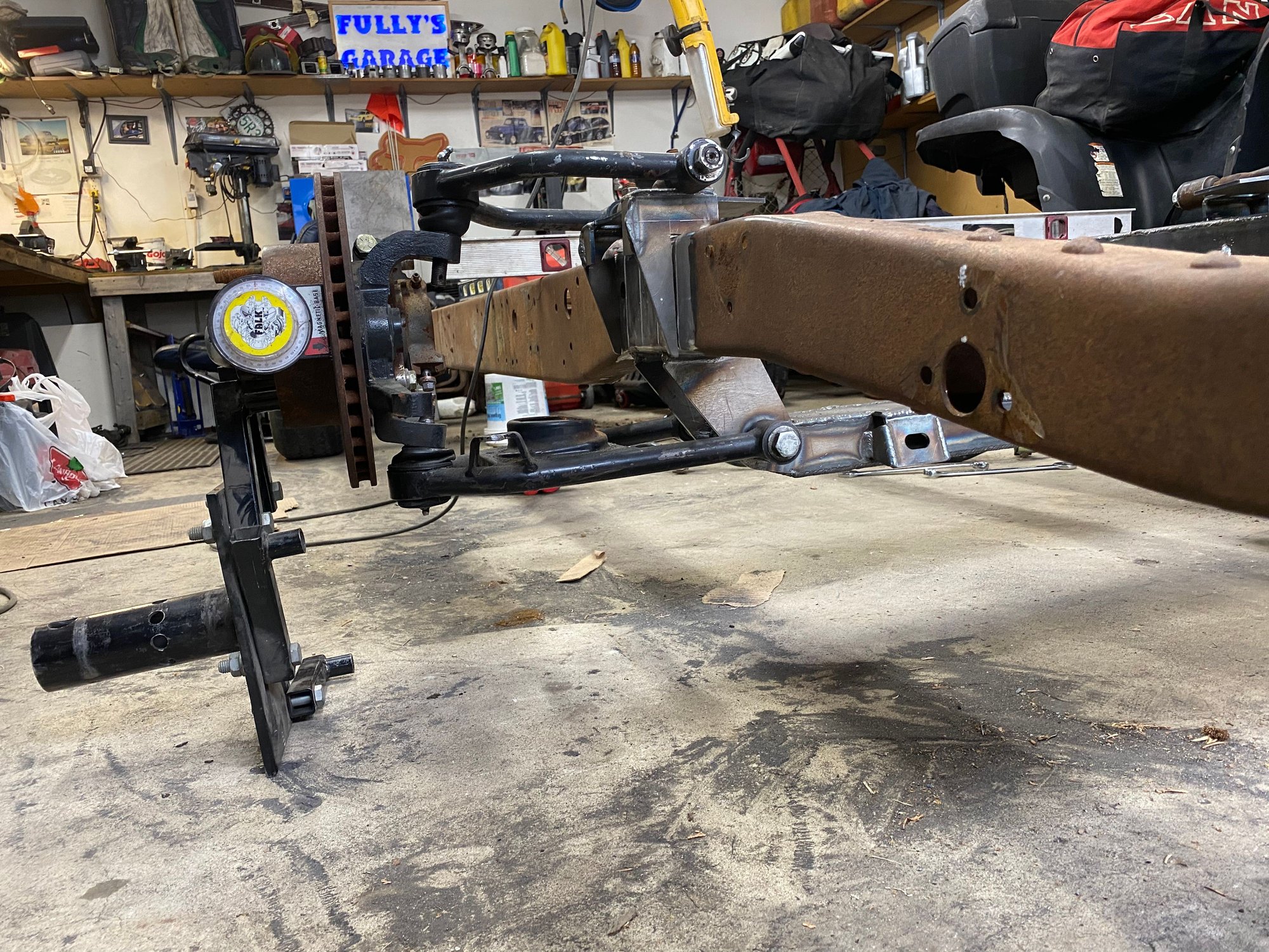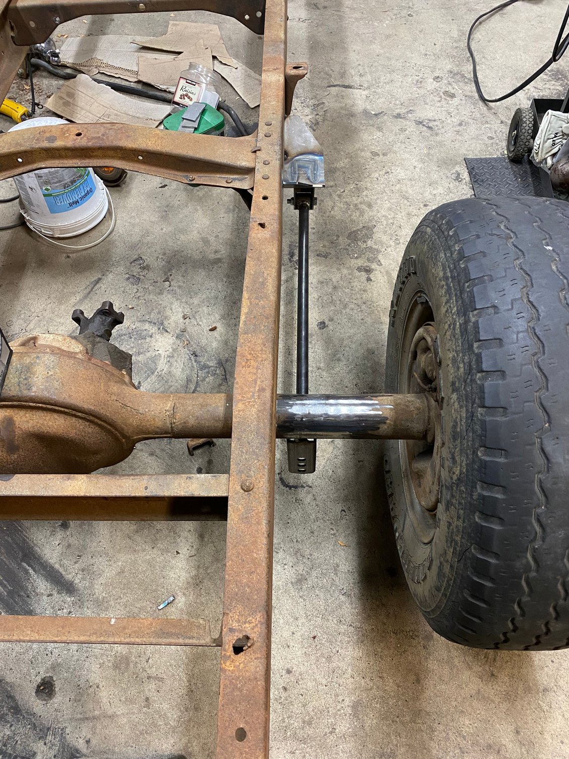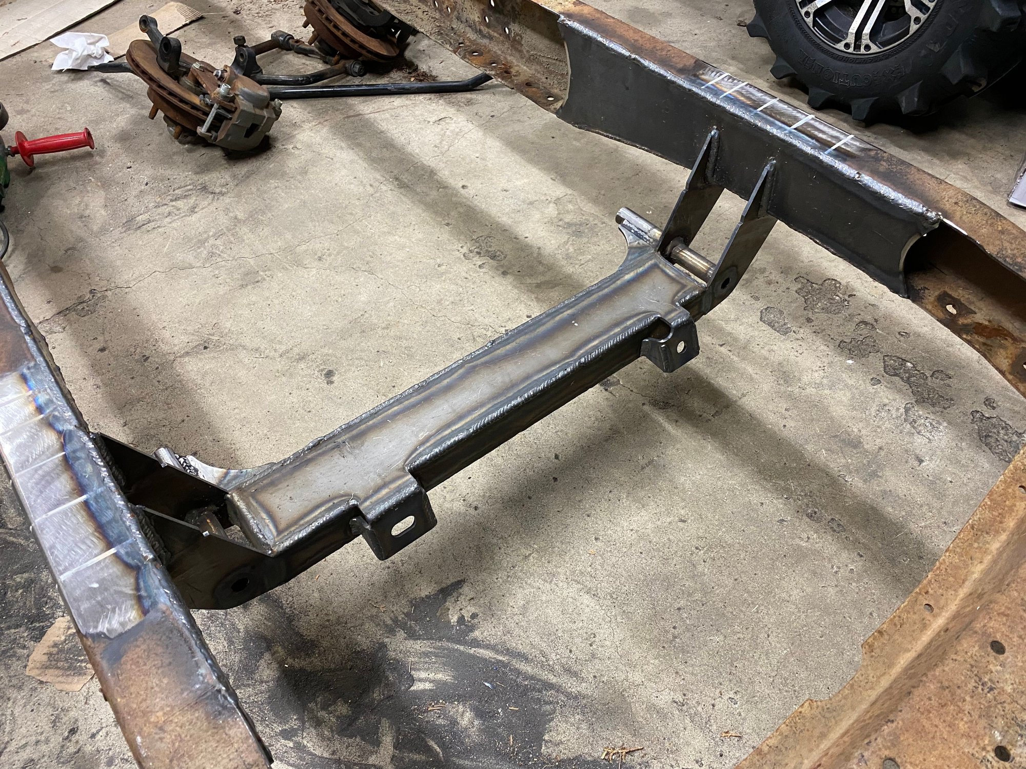 Redid the rear bottom links. Moved them to inside the frame. Where I had them I wasn’t going to be able to put the shocks on. I could of went farther out but I jumped the gun and welded the front anchor mounts. Im not using that crossmember for the upper mount. Just needed something to mock it up with. But will be making something very similar