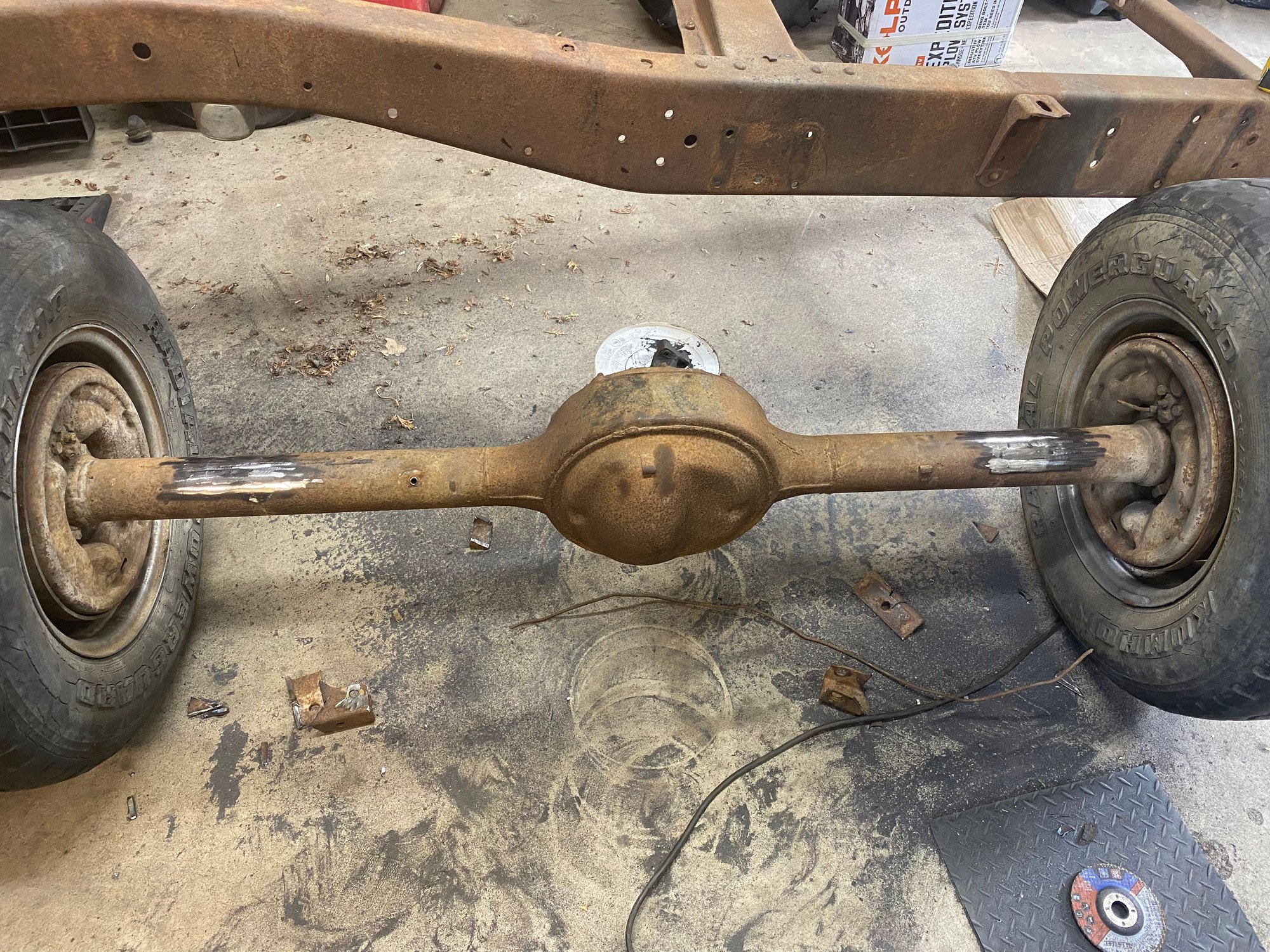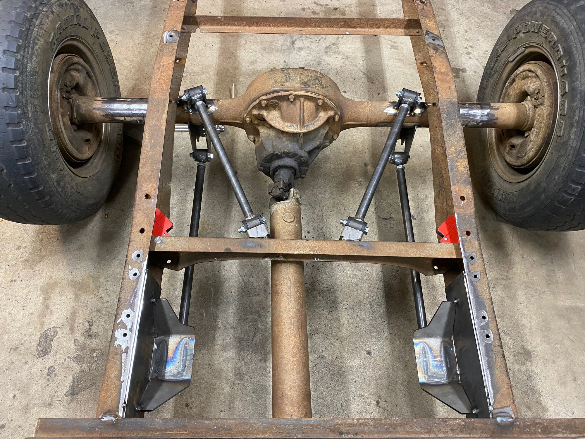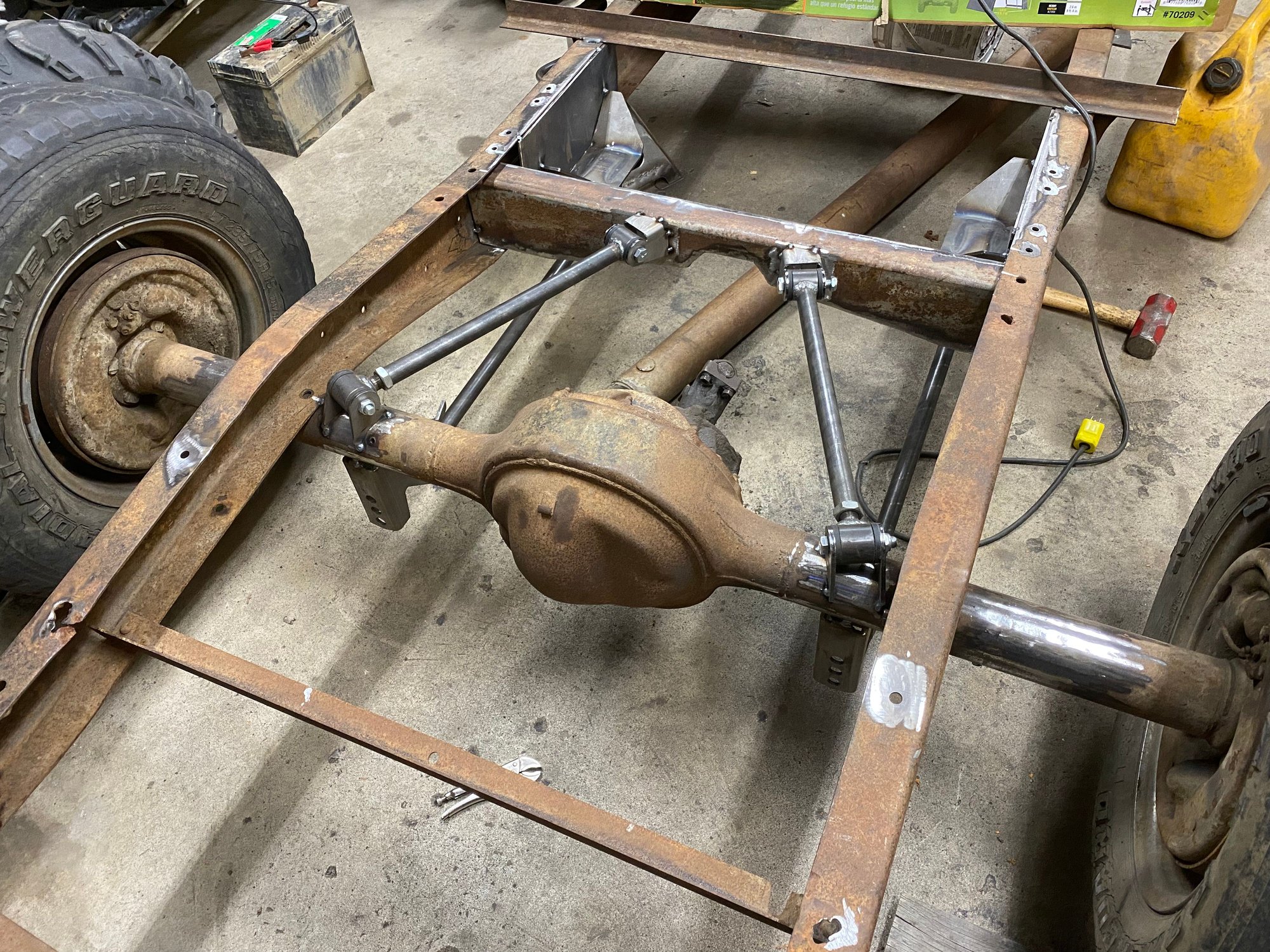 started on the rear. Got the axle all cleaned up and ready for new brackets. And tacked in the lower 4 link bars.