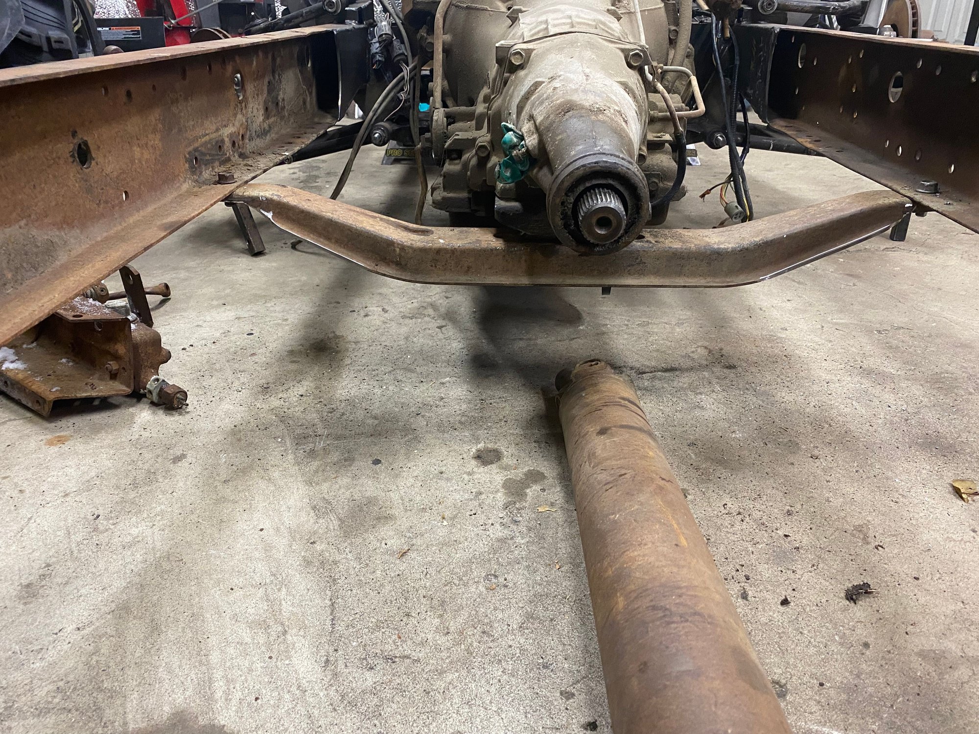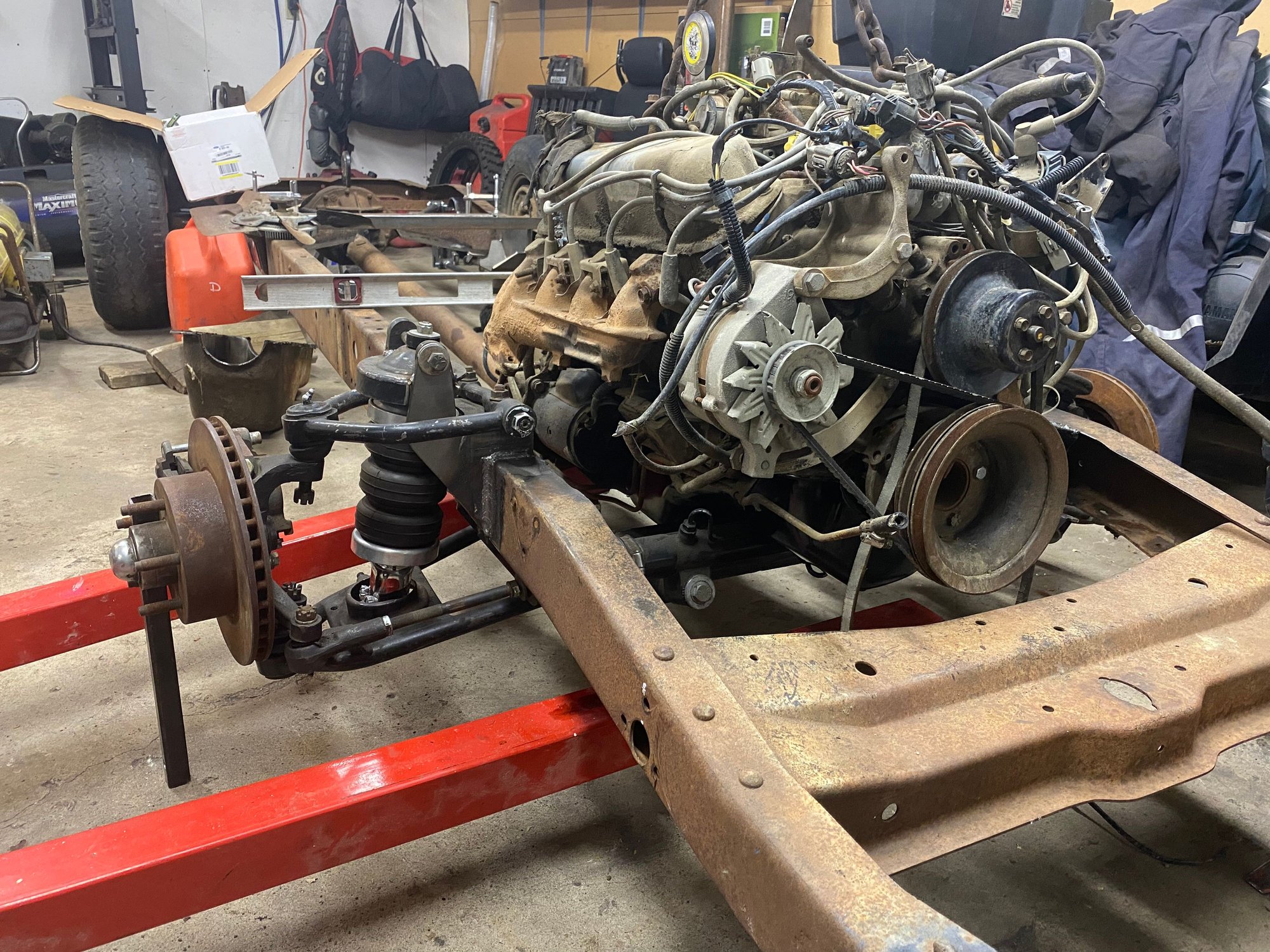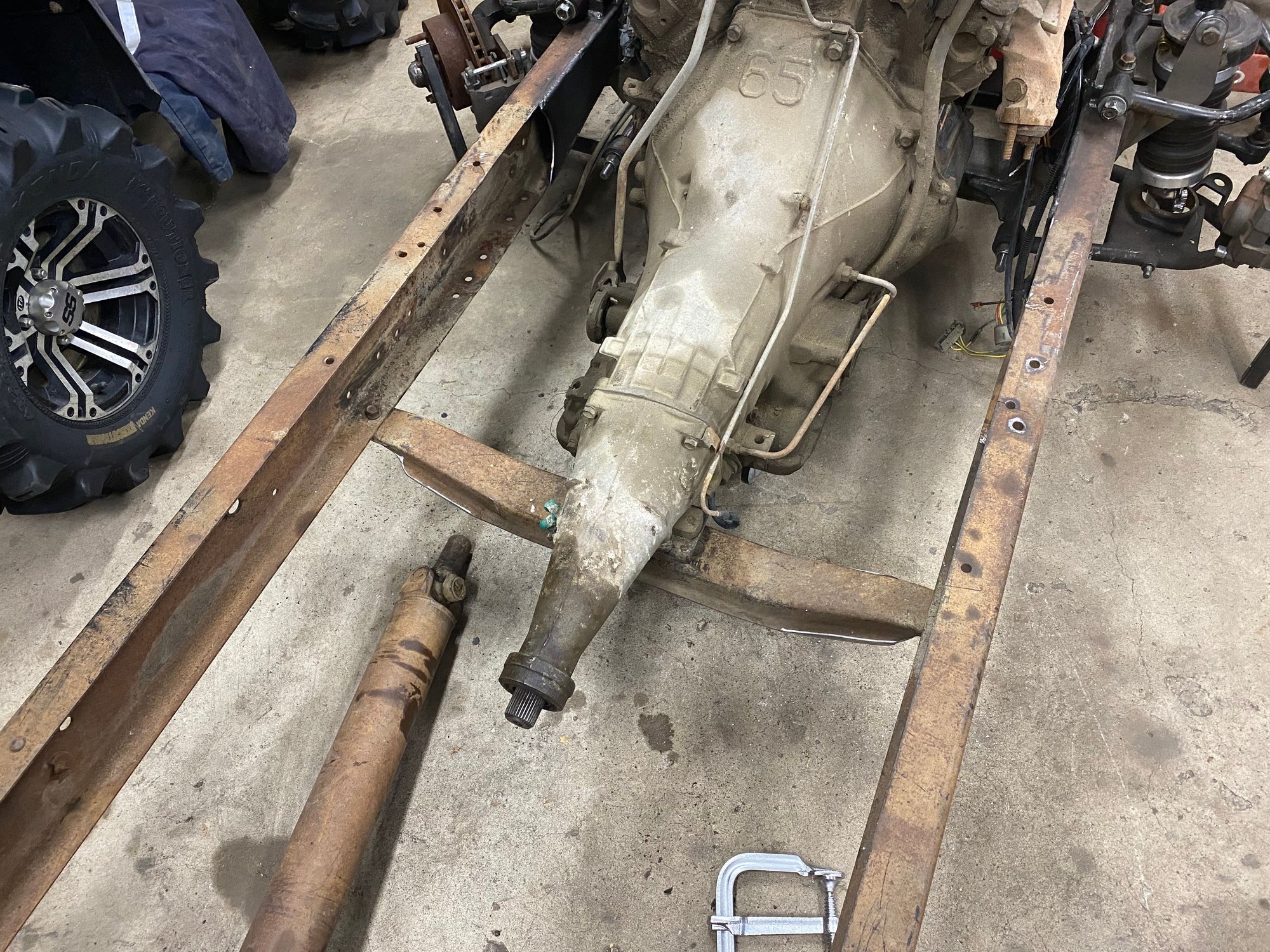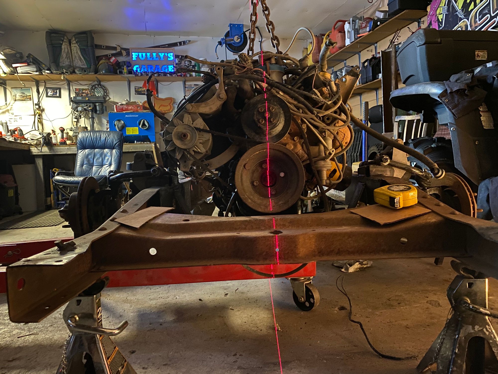 Little more progress. Got the engine and trans finally mounted. Used a laser to center the engine and then leveled it at the carb. Cut cut out pieces to make engine mounts. For the trans I reused the original engine mount. Cut trimmed and it worked out perfect.