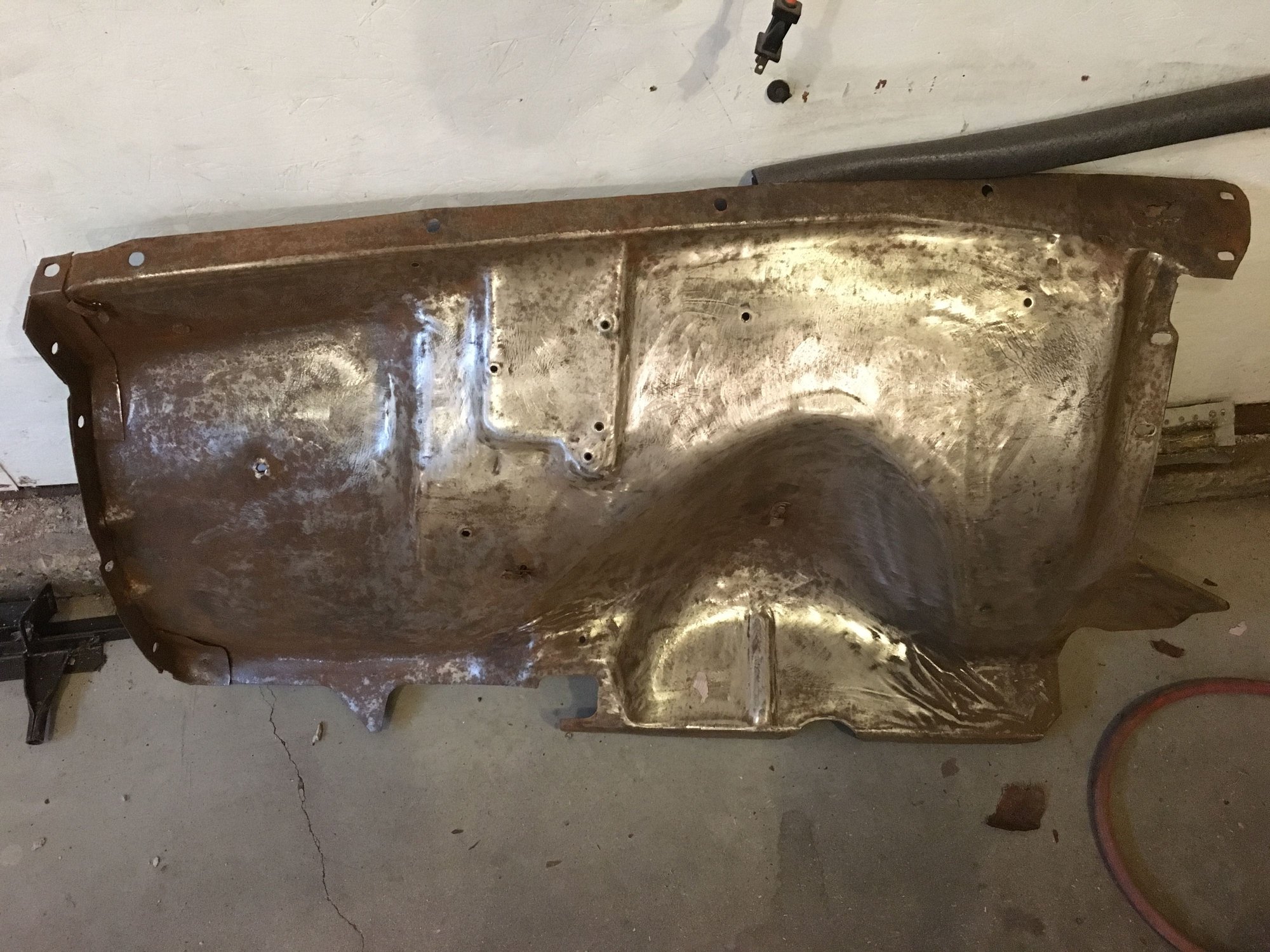 Wire wheeled the other side inner fender and the driver's fender. They are in pretty good shape with the usual pinholes above the headlights on the fenders. Not as much bondo on this side but has a good dent on lower front. Cleaned up nice.