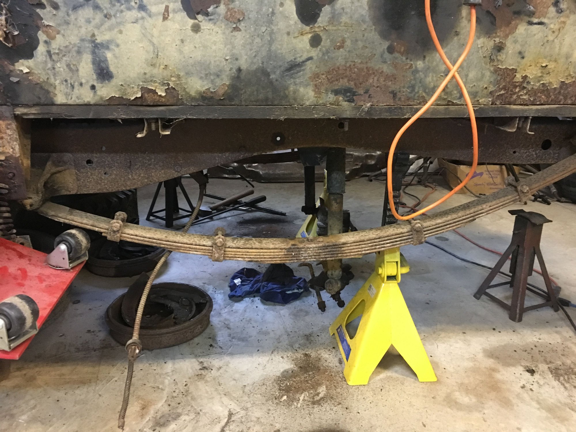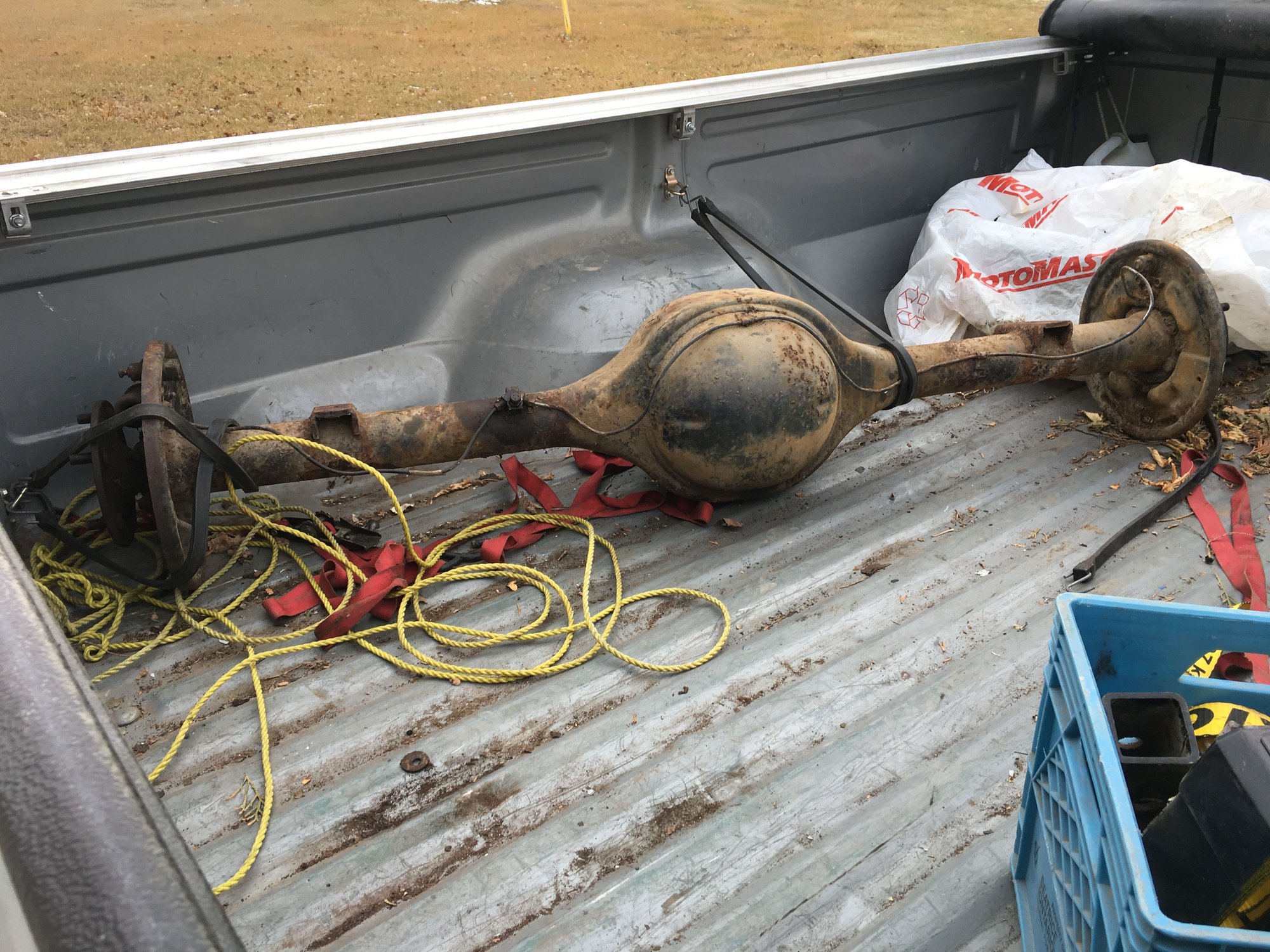 Rear diff is out and off for a rebuild. It had 3.96 gears so I opted for 3.50s instead to help keep rpms down at highway speeds. Will take some work getting the front leaf spring pin out, it is in there good! Heading off to the driveline shop for rebuild.