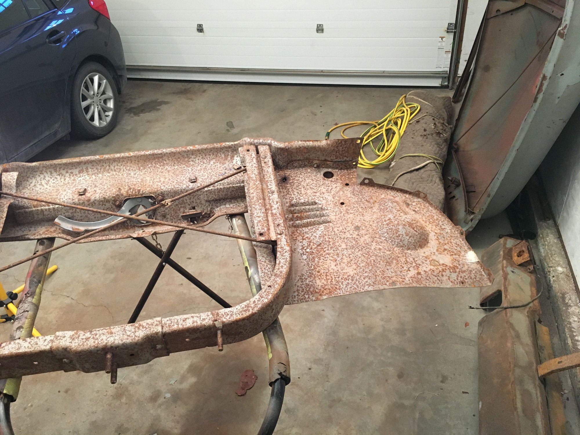 Will replace floors even though rust is not all the way through they are getting a little thin. Will keep brace and weld in front halves and rear section. Cab not off of frame yet.